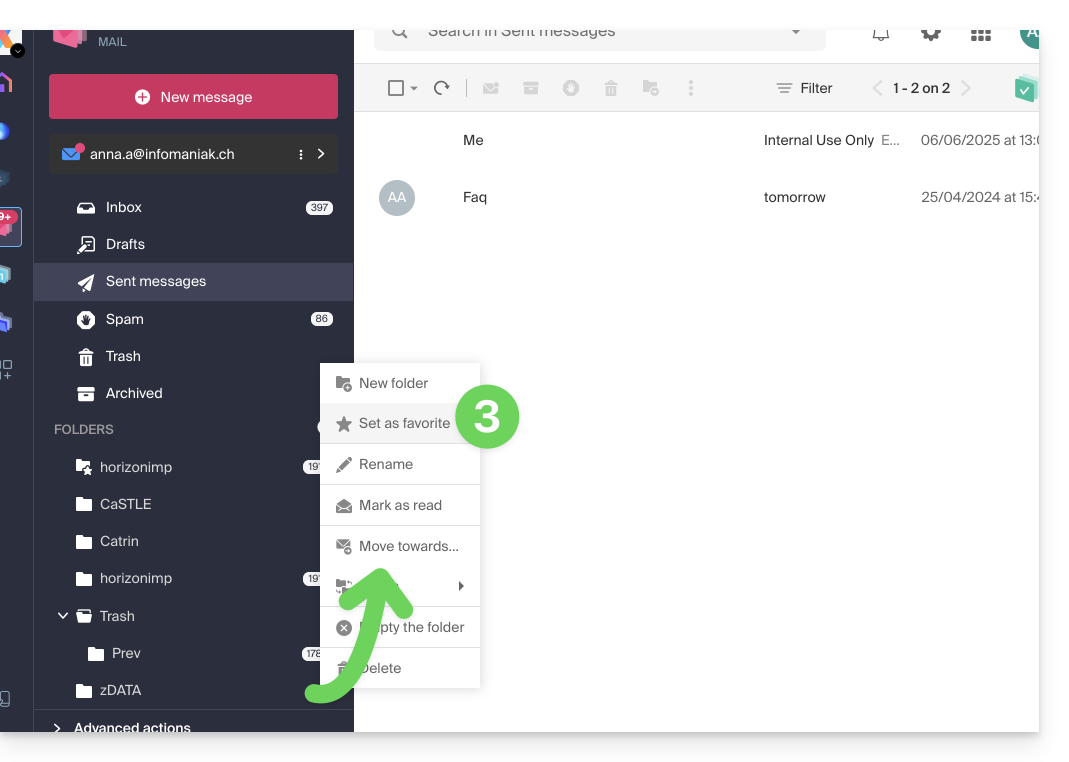 Diese Anleitung erklärt, wie Sie einen Ordner oder Unterordner als Favorit in der Web-App Mail von Infomaniak (Online-Dienst ksuite.infomaniak.com/mail) hinzufügen.
