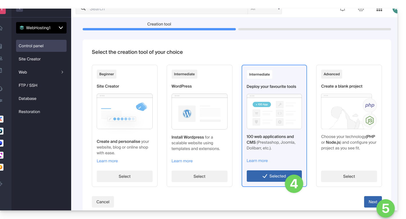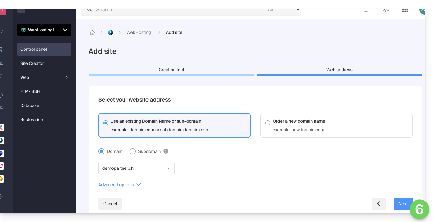 - Select the domain or subdomain and the advanced options if necessary, then click Next: