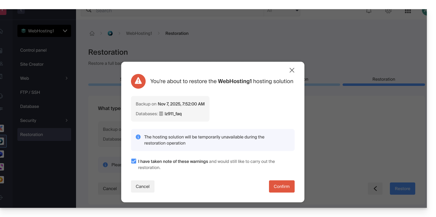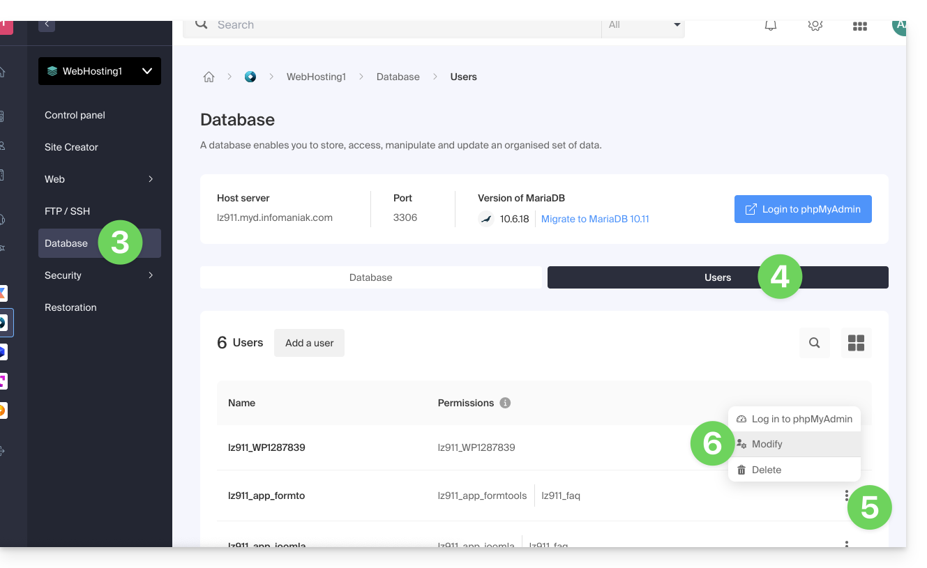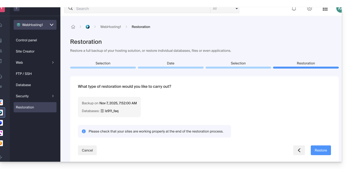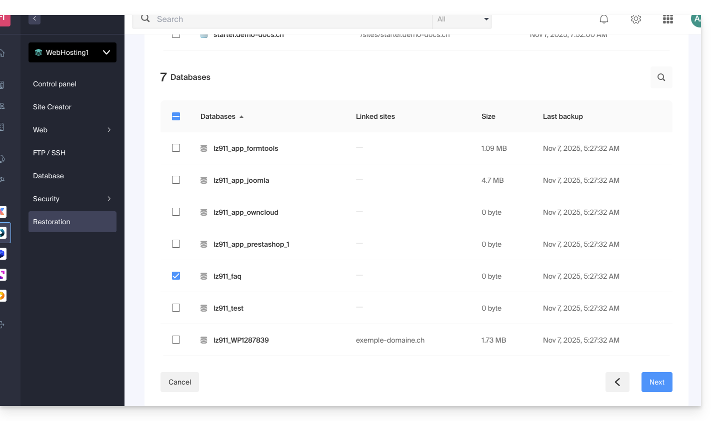 This guide explains how to access MySQL/MariaDB backups and restore a specific database from an Infomaniak hosting.