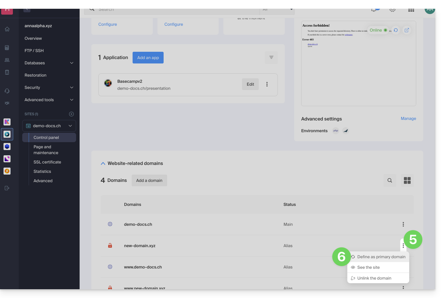 - Une fois le nouveau nom de domaine lié à votre site, cliquez sur le menu d'action ⋮ à droite de celui-ci.