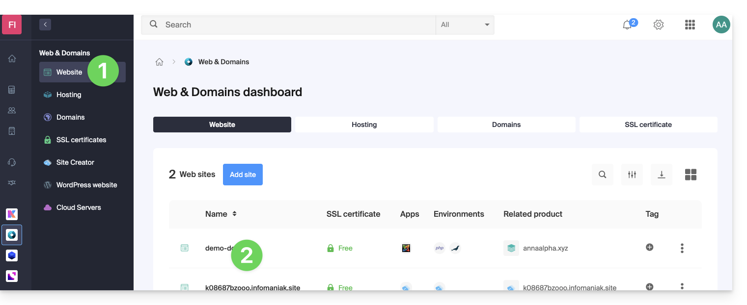 - Cliquez ici afin d'accéder à la gestion de votre site sur le Manager Infomaniak (besoin d'aide ?).