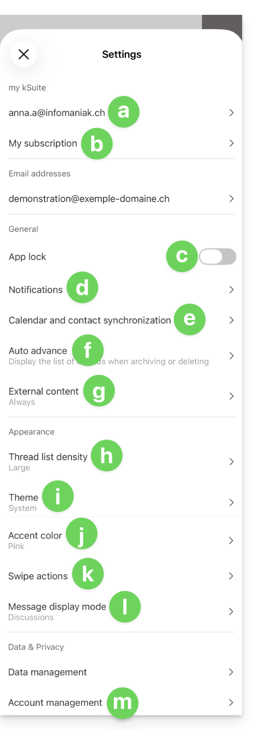 Questa guida spiega come configurare e personalizzare la visualizzazione globale dell'app Web Mail Infomaniak (servizio online ksuite.infomaniak.com/mail).