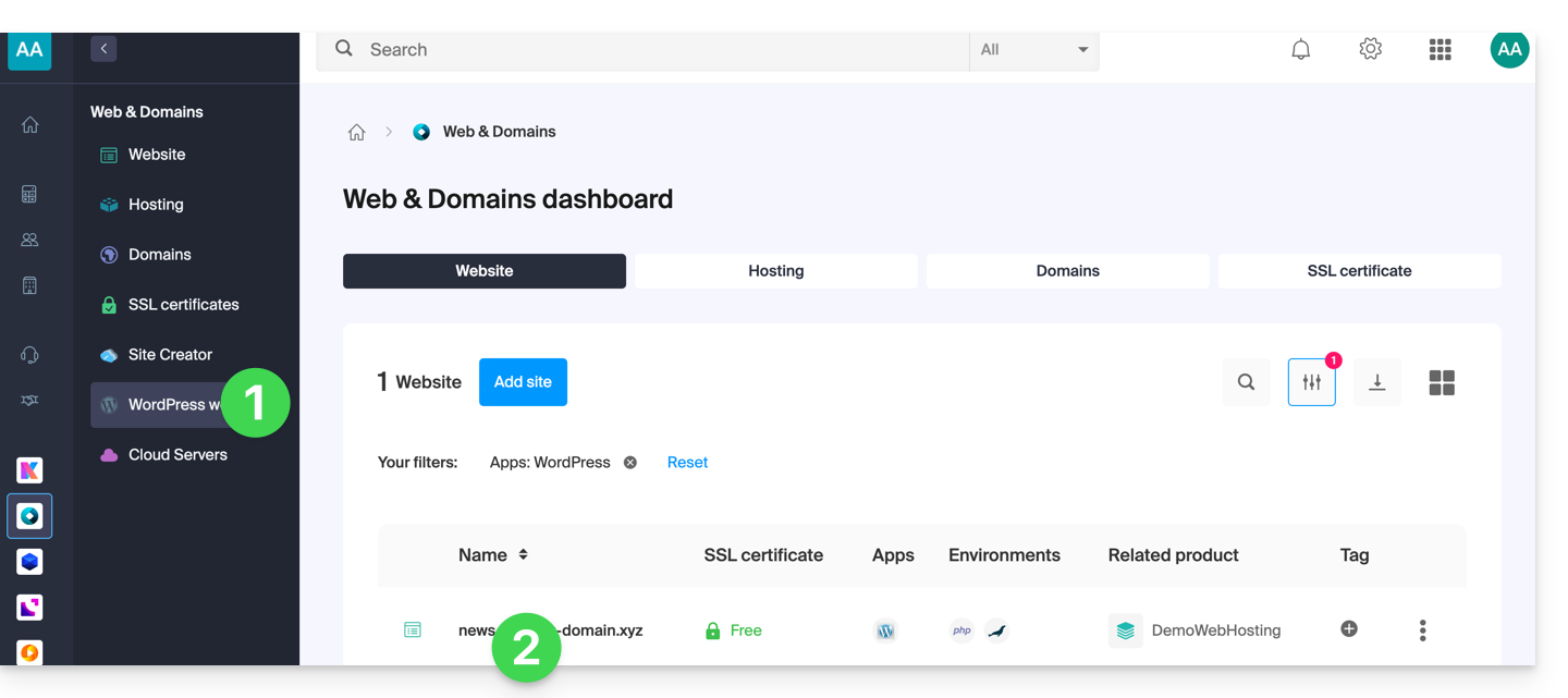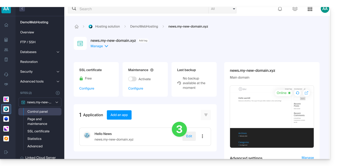 - Wenn Ihre Website hier nicht angezeigt wird, wurde sie nicht über die Infomaniak-Tools installiert… nehmen Sie die offizielle Dokumentation zur Kenntnis.