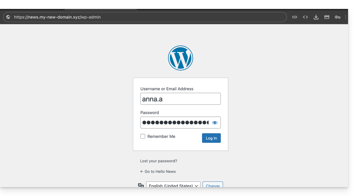 - Geben Sie den Benutzernamen und das Passwort ein, die Sie bei der Installation von WordPress gewählt haben:
