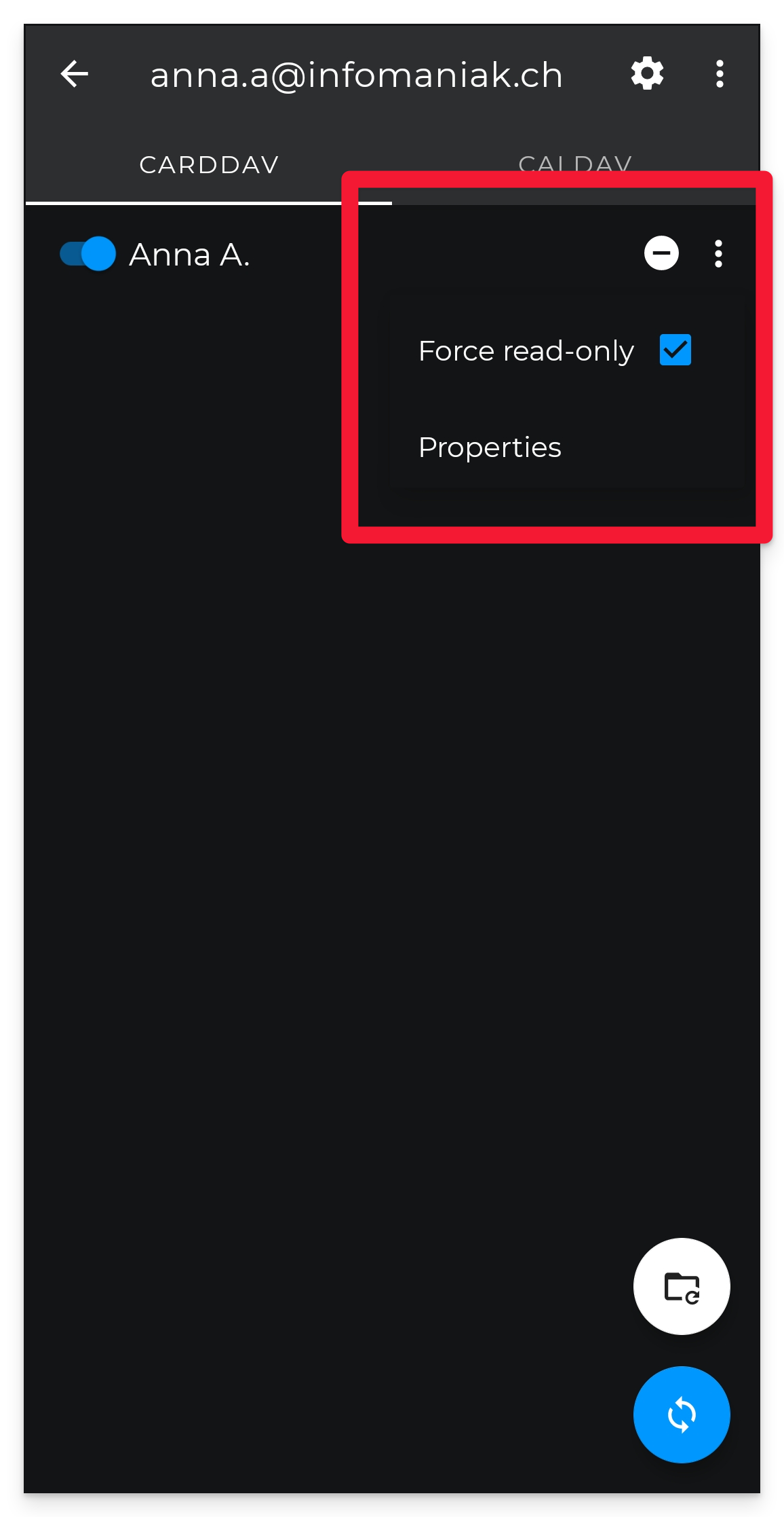 Dazu drücken Sie auf der Einstellungsseite des Infomaniak-Kontos, das Sie interessiert, im Tab Adressbücher CARDDAV oder Kalender CALDAV auf das Aktionsmenü ⋮ rechts neben der Zeile Ihrer synchronisierten Elemente. Aktivieren Sie das Kontrollkästchen "Schreibschutz erzwingen":