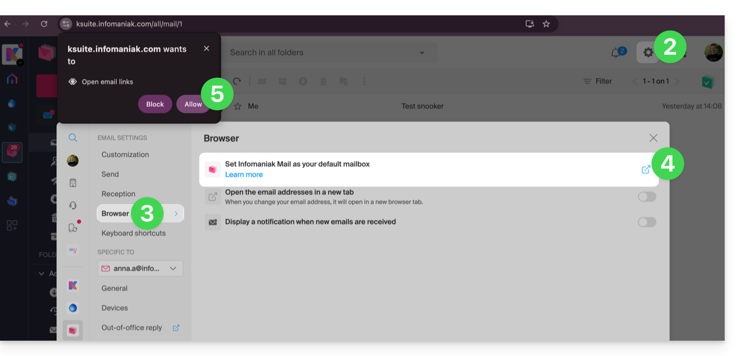 Um Probleme bei der Verwendung von Infomaniak Mail als Standard-E-Mail-Anbieter zu beheben, folgen Sie den manuellen Anweisungen Ihres üblichen Browsers: