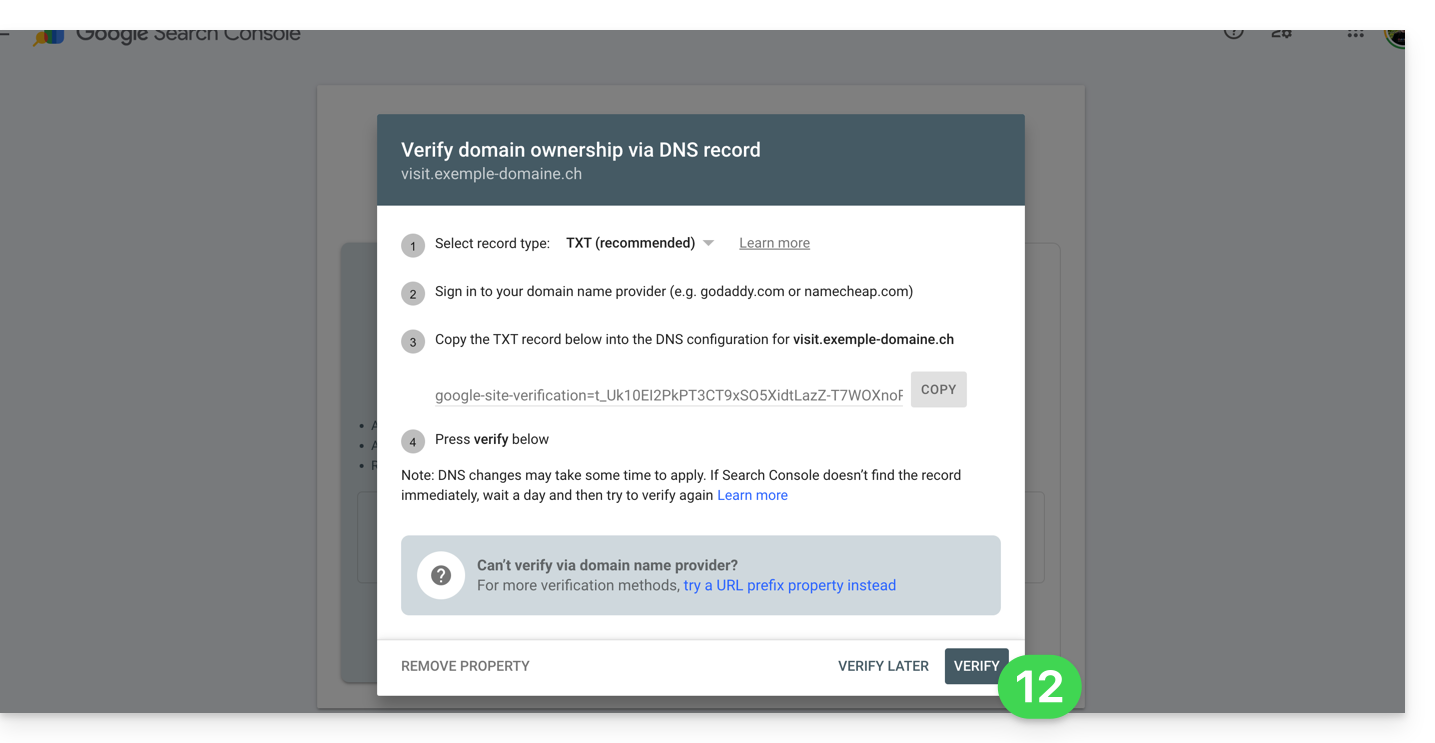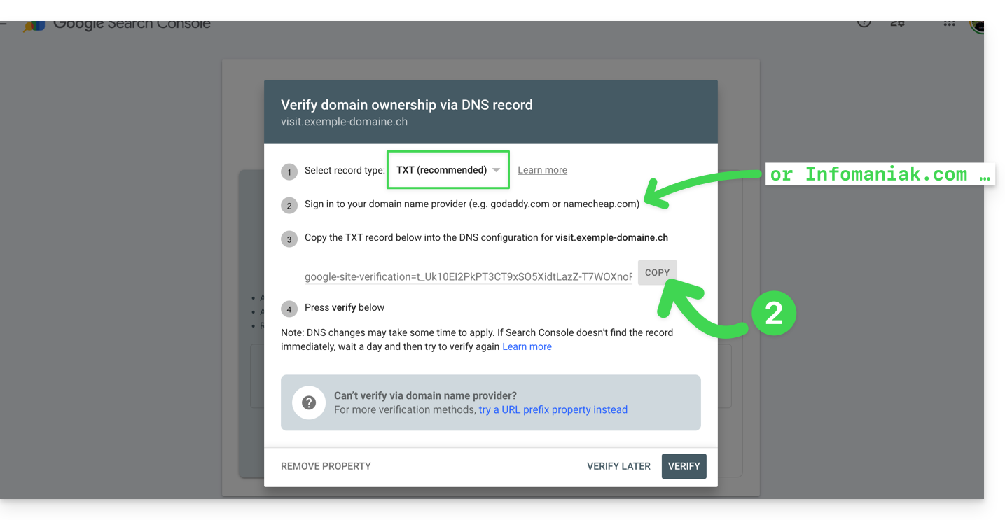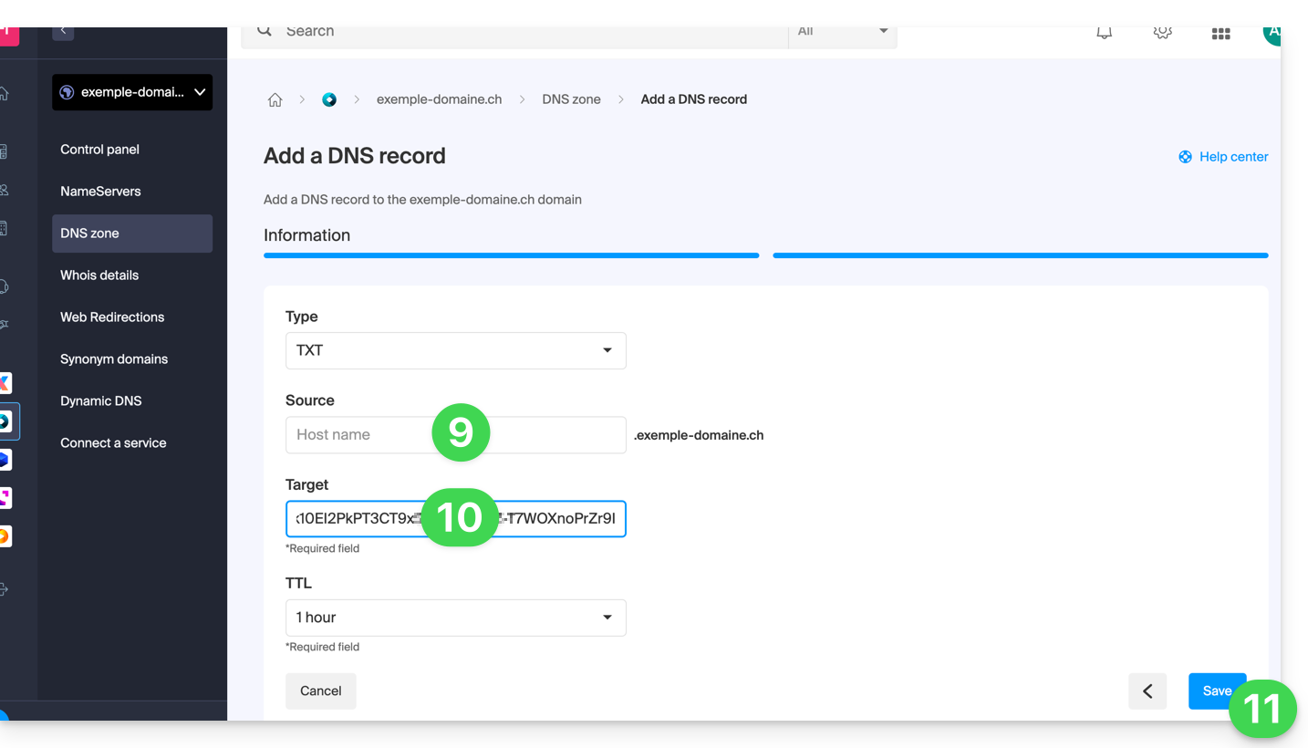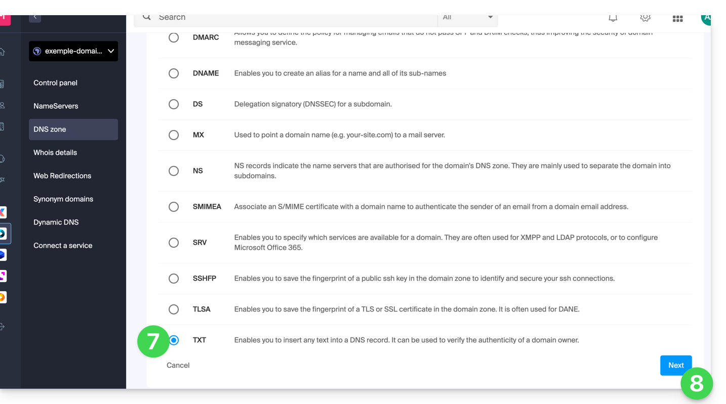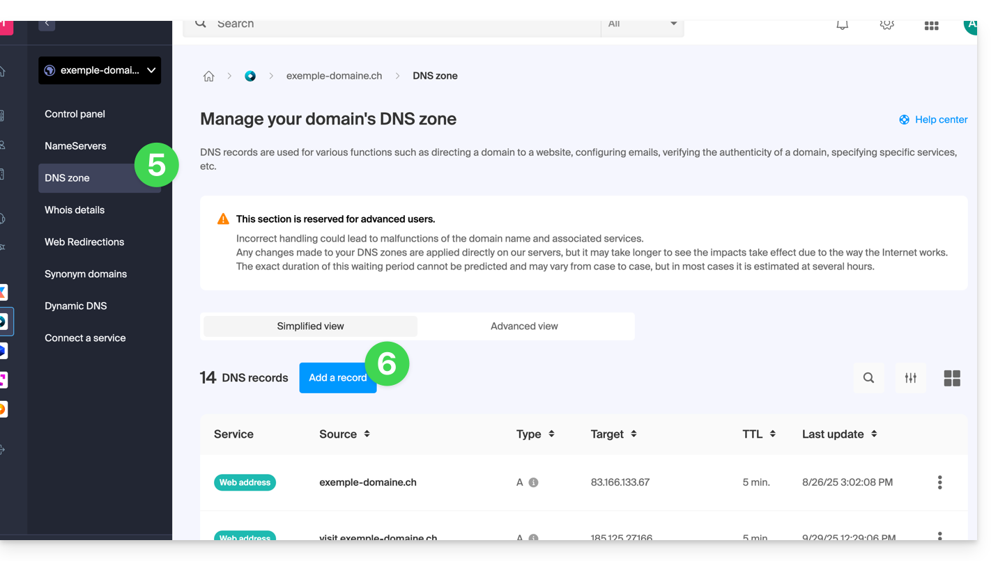 - die Methode zur Überwachung einer gesamten Domain, die eine Verifizierung erfordert, die auf Ebene Ihres Domainnamens durchgeführt werden muss (auf der Infomaniak-Schnittstelle, wenn Ihr Domainname/DNS-Bereich von Infomaniak verwaltet wird),