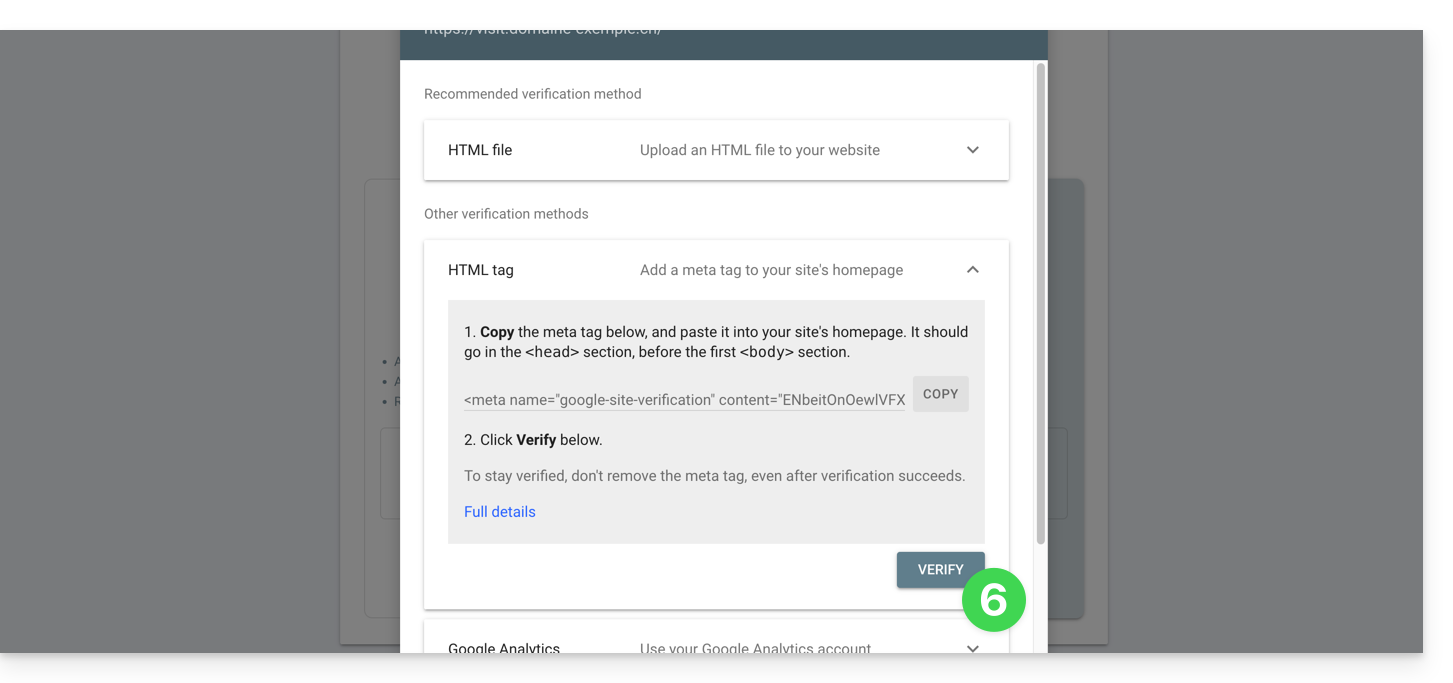 - Klicken Sie auf den Pfeil , um den Abschnitt HTML-TAG zu erweitern, der die in Site Creator einzufügende Information zum Nachweis der Zugehörigkeit enthält.