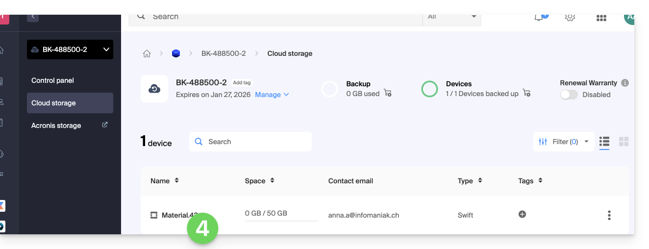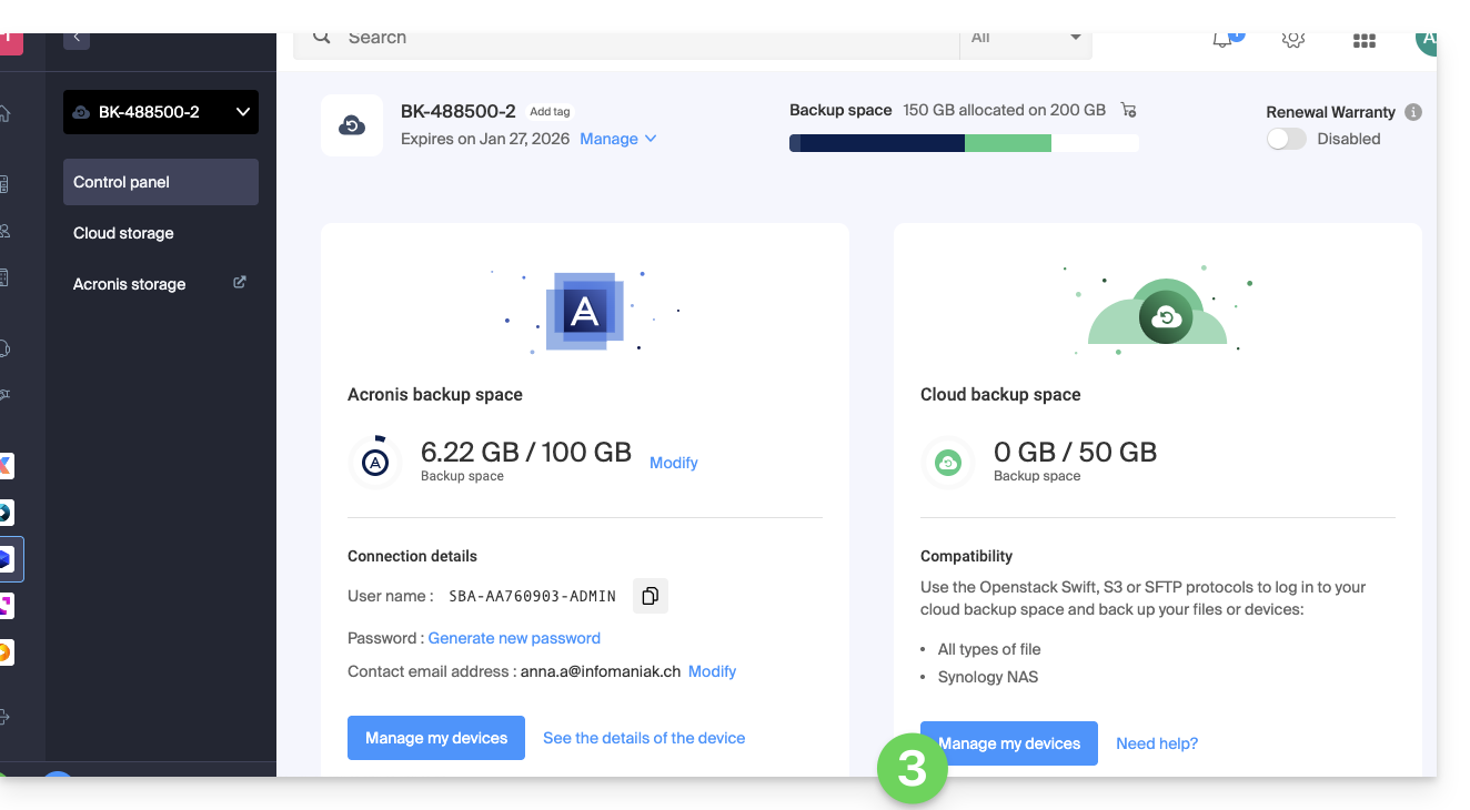 Um auf die Verwaltung des Produkts Swiss Backup (Acronis oder Cloud-Speicher) zuzugreifen, mĂĽssen Sie sich beim Infomaniak Manager anmelden: Nehmen Sie sich Zeit, um diese andere Anleitung zu diesem Thema zu lesen.