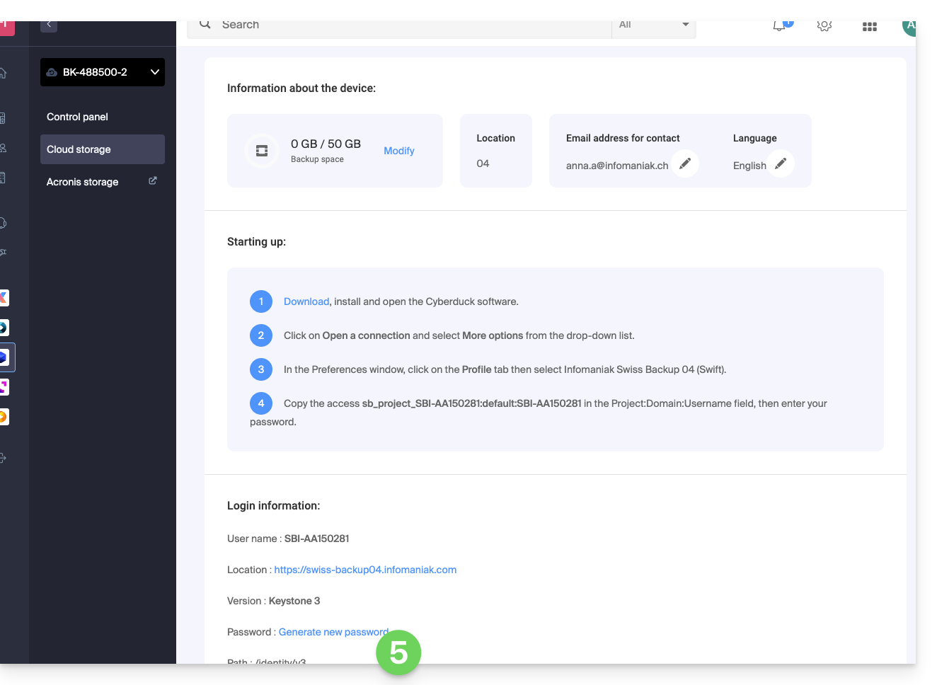 Dieser Leitfaden beschreibt, wie Sie die Anmelde- und Konfigurationsinformationen von Swiss Backup (freie Backup-Lösung vom Typ Openstack Swift, S3, SFTP...), der Backup-Lösung in einer unabhängigen Schweizer Cloud, erhalten.