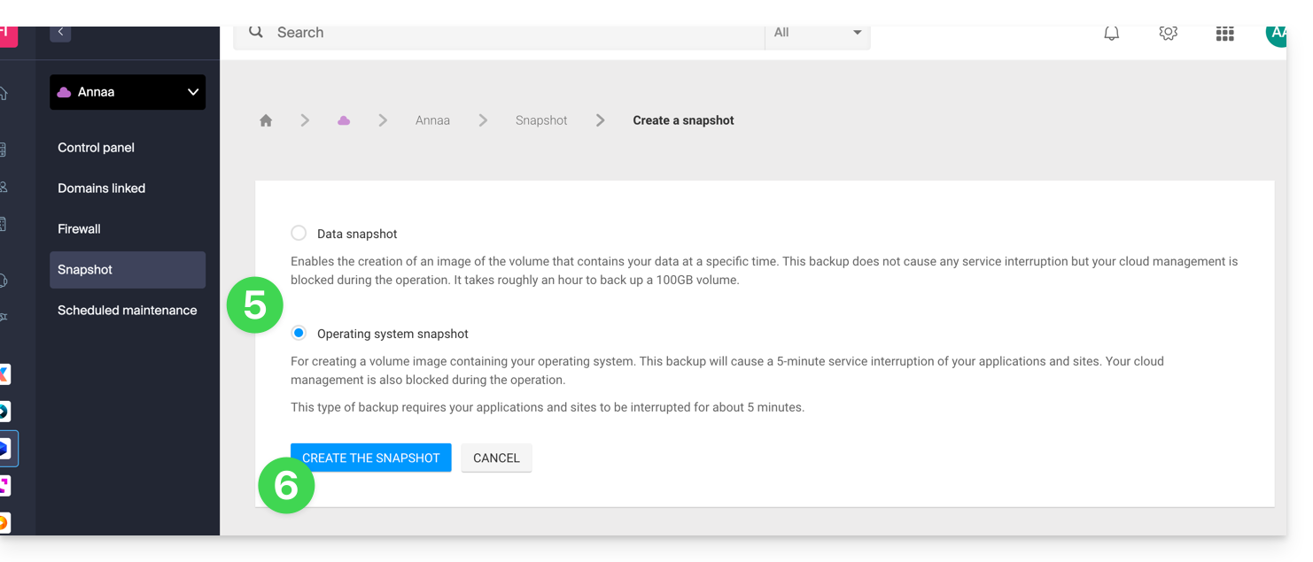 - Snapshot des Betriebssystems: ermöglicht die Erstellung eines Bildes des Volumens, das Ihr Betriebssystem enthält. Diese Art der Sicherung erfordert eine Unterbrechung Ihrer Anwendungen und Websites für einige Minuten.