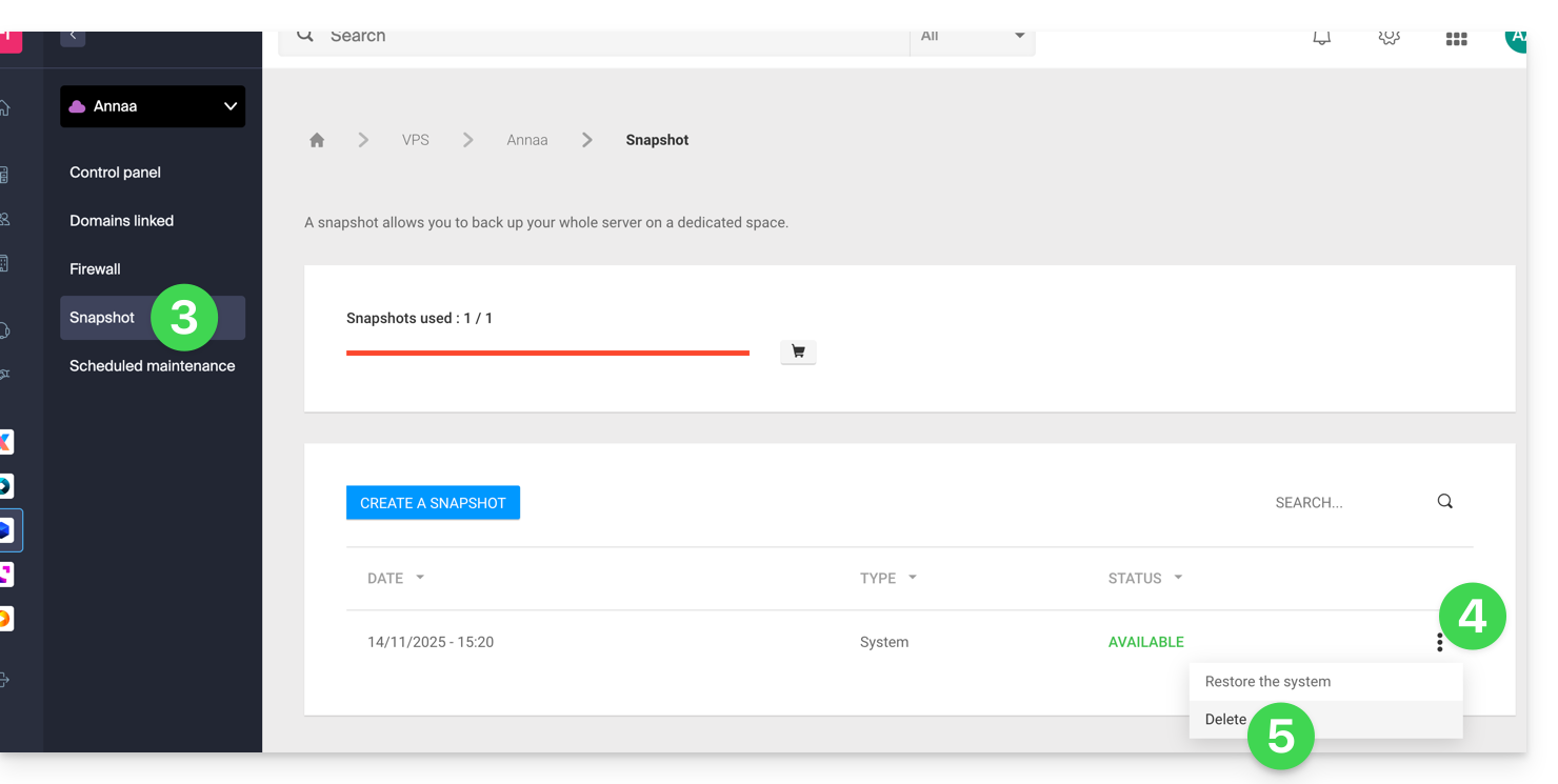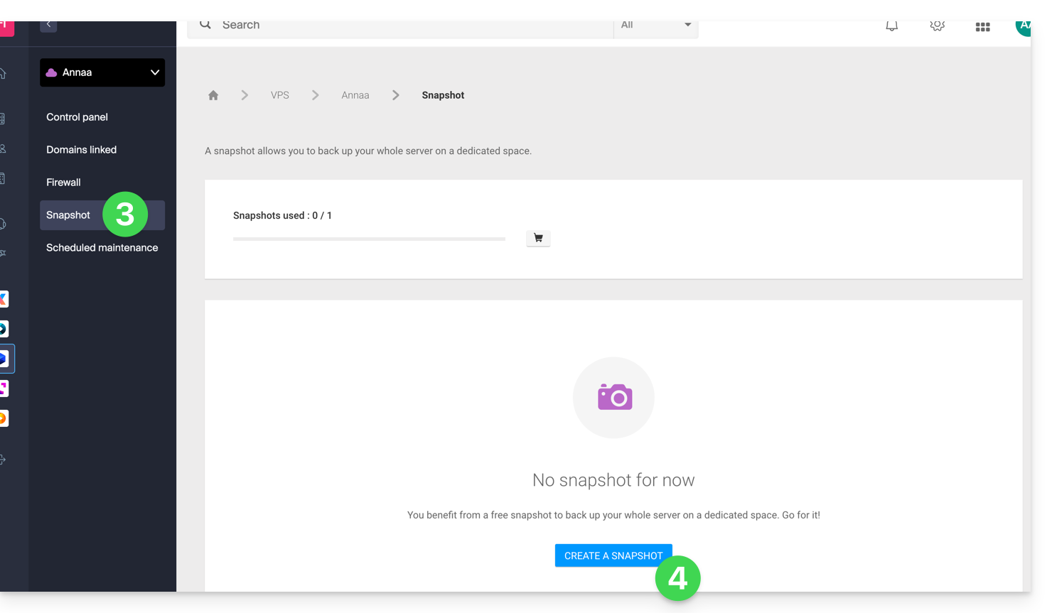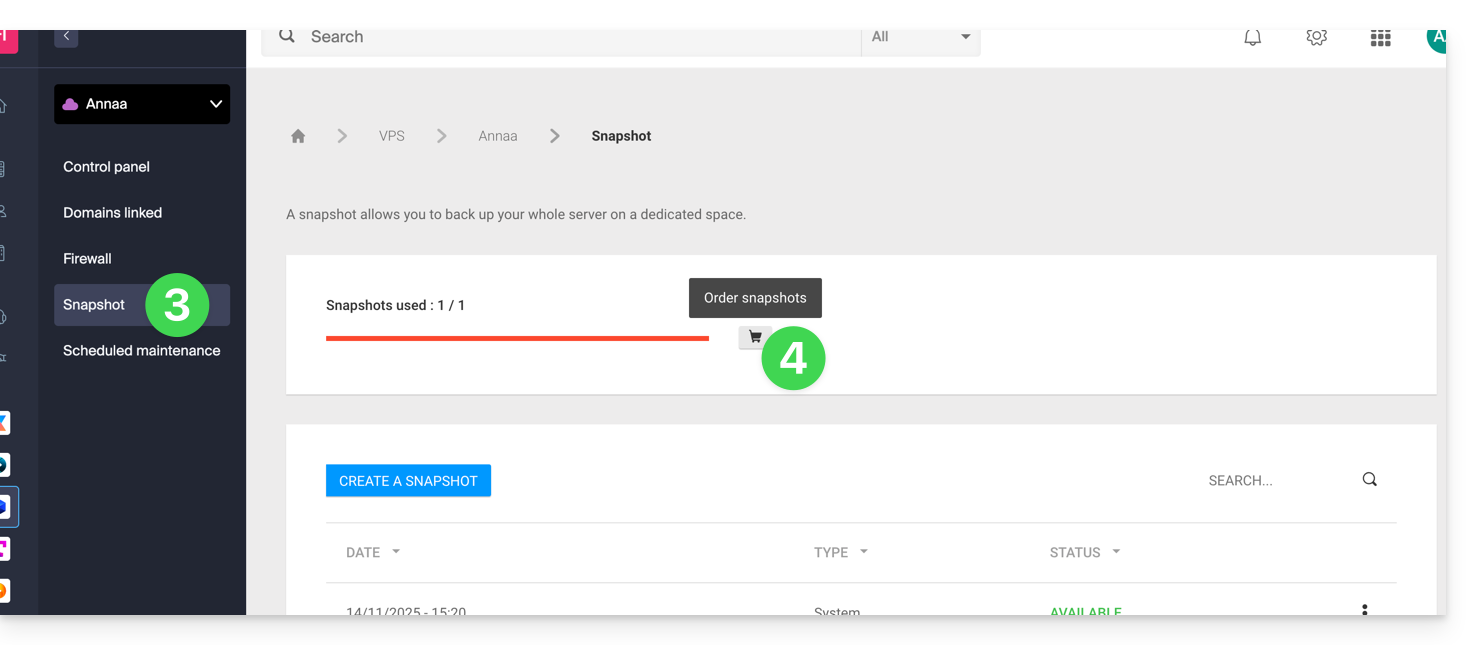 - Es wird empfohlen, regelmäßig Snapshots zu erstellen, z. B. einmal pro Woche oder Monat; dies ermöglicht es Ihnen, einen Verlauf Ihres VPS Cloud zu haben und im Falle eines Problems zurückzukehren.