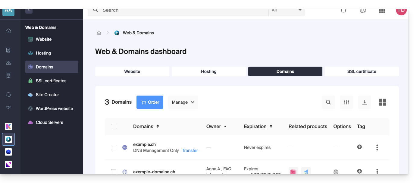 Indem Sie Ihre Domains, Websites und E-Mail-Adressen bei Infomaniak zusammenfassen, vereinfachen Sie die Verwaltung Ihrer Rechnungen und Dienstleistungen. Zudem wird die Verknüpfung Ihrer Domains automatisch mit Ihrer Website und Ihrer E-Mail-Adresse erfolgen. Sie müssen daher die DNS-Einstellungen Ihrer Domains bei einem anderen Registrar nicht manuell konfigurieren.