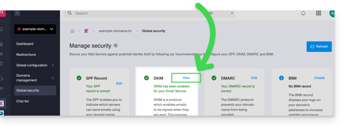 - Die DKIM-Norm ist für alle Infomaniak-Kunden aktiviert, die einen Mail-Service besitzen, dessen Domainname seine DNS-Zone bei Infomaniak verwaltet. Alle E-Mails, die von Mail oder dem E-Mail-Programm/Client Ihrer Wahl gesendet werden, sind daher automatisch signiert.