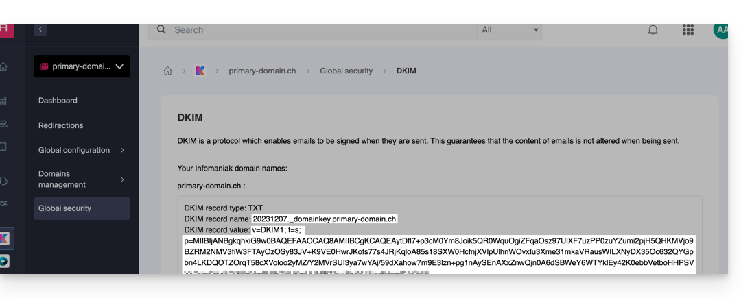 - Der Eintragstyp DKIM (Domain Keys Identified Mail) ist ein Protokoll, das es ermöglicht, E-Mails beim Senden zu signieren und die optimale Funktion Ihres Infomaniak-Mail-Systems zu gewährleisten.