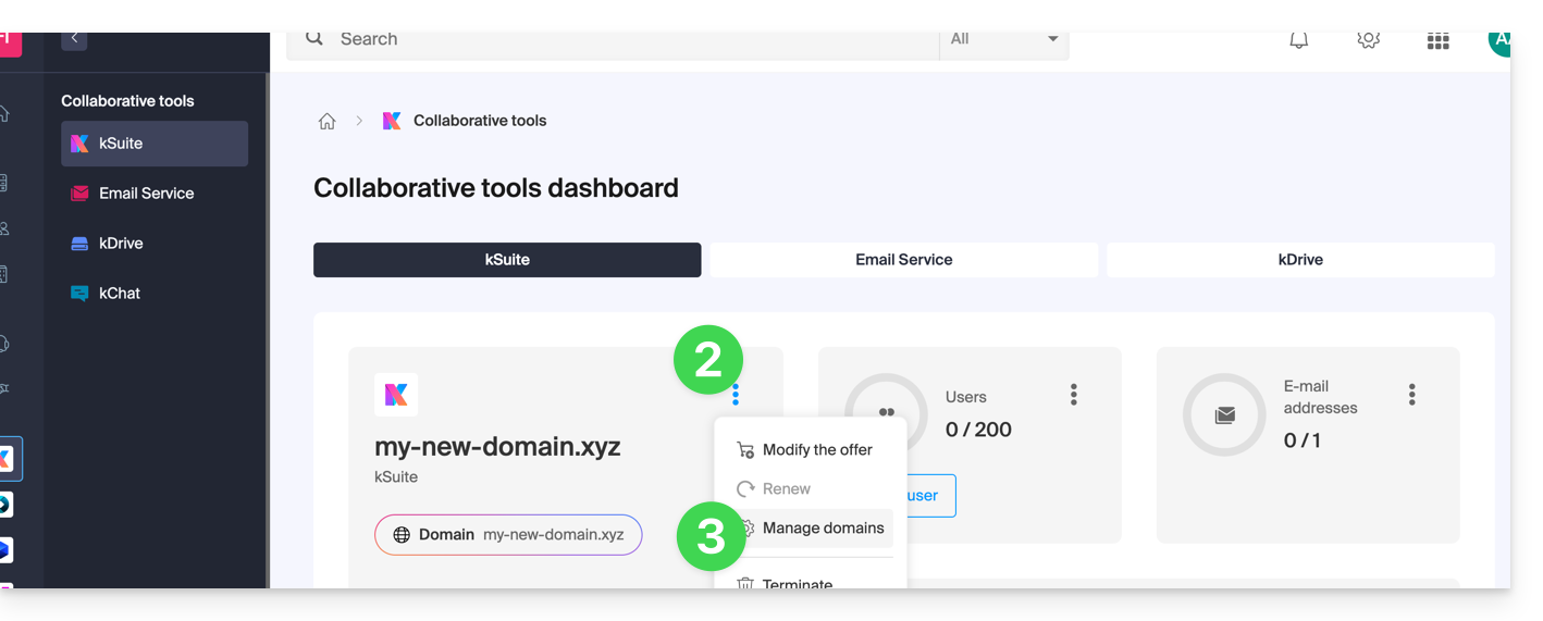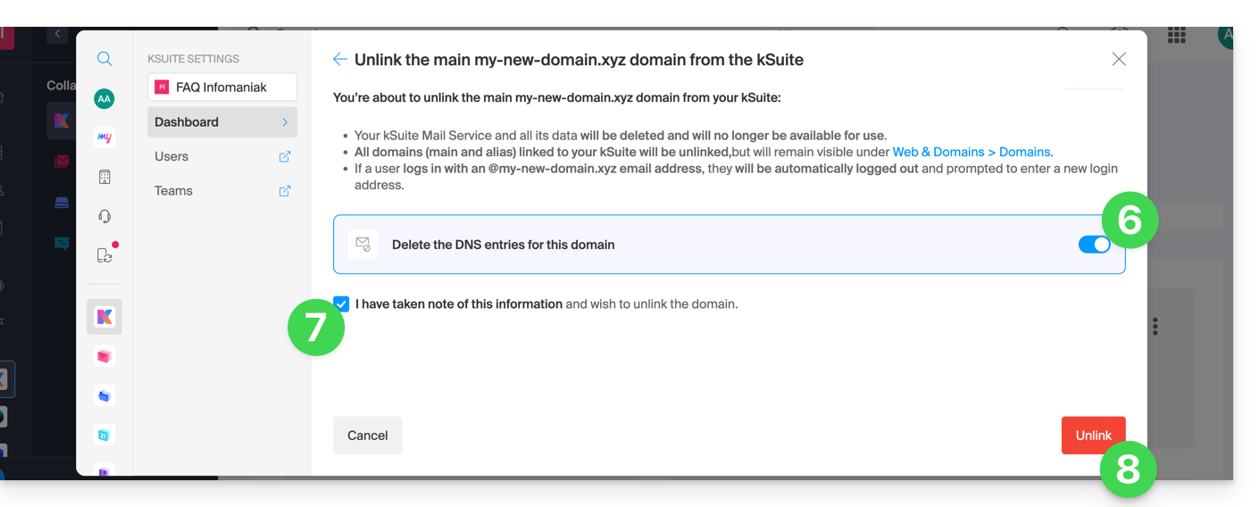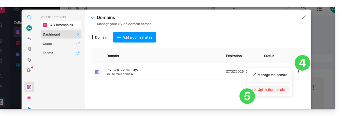 Um einen Domainnamen von kSuite Gratuit zu trennen: