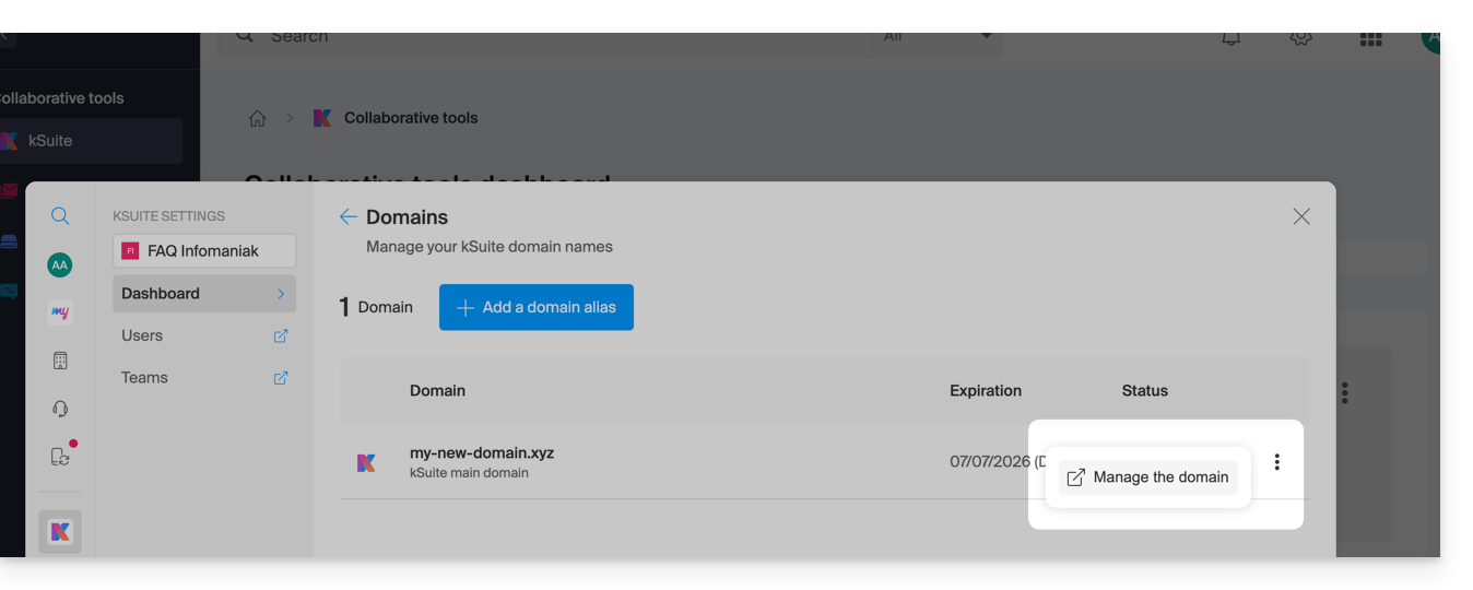 - Klicken Sie hier, um auf die Verwaltung Ihrer kSuite im Infomaniak Manager zuzugreifen (Hilfe benötigt?).