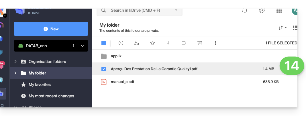 - Die kDrive-Struktur wird im linken Seitenmenü angezeigt.