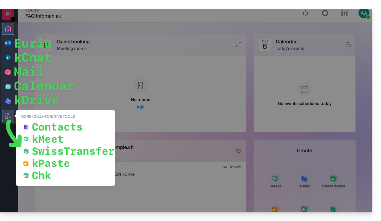 Dieser Leitfaden stellt Ihnen die kSuite-Räume vor, die Suite von Produktivitäts- und Kollaborationstools, die in der Schweiz von Infomaniak entwickelt wurde.