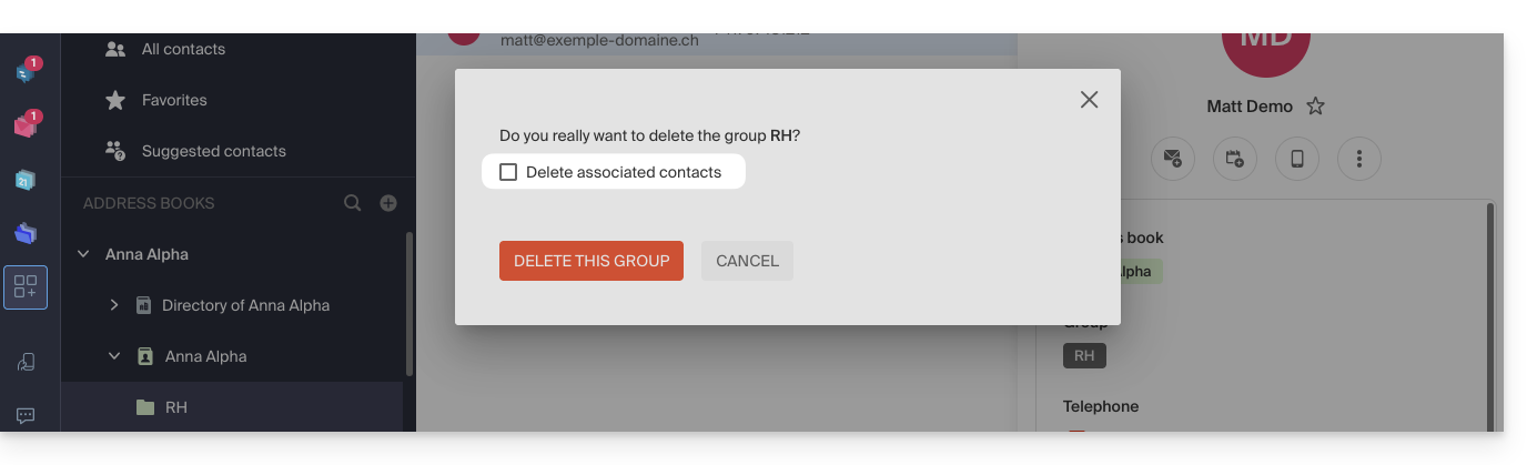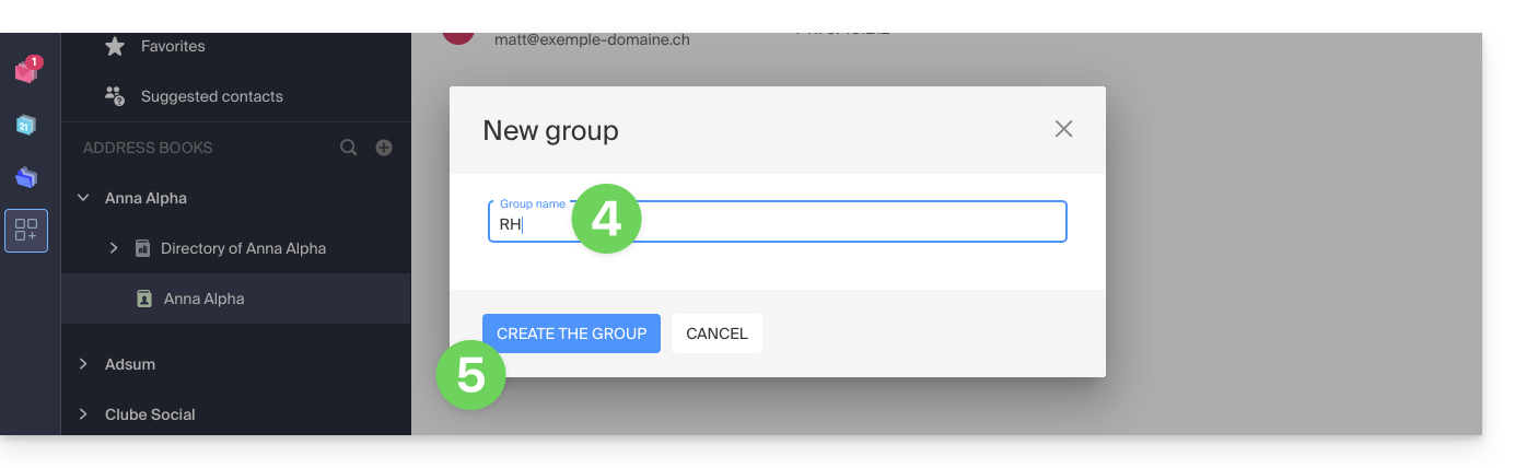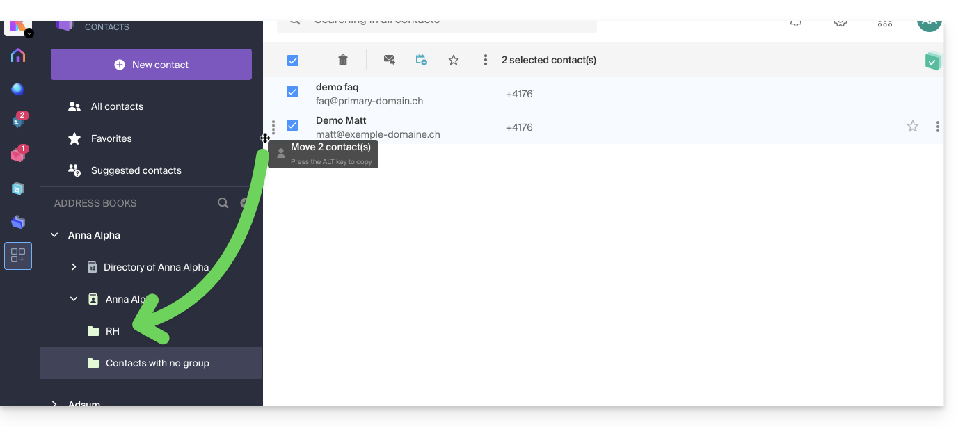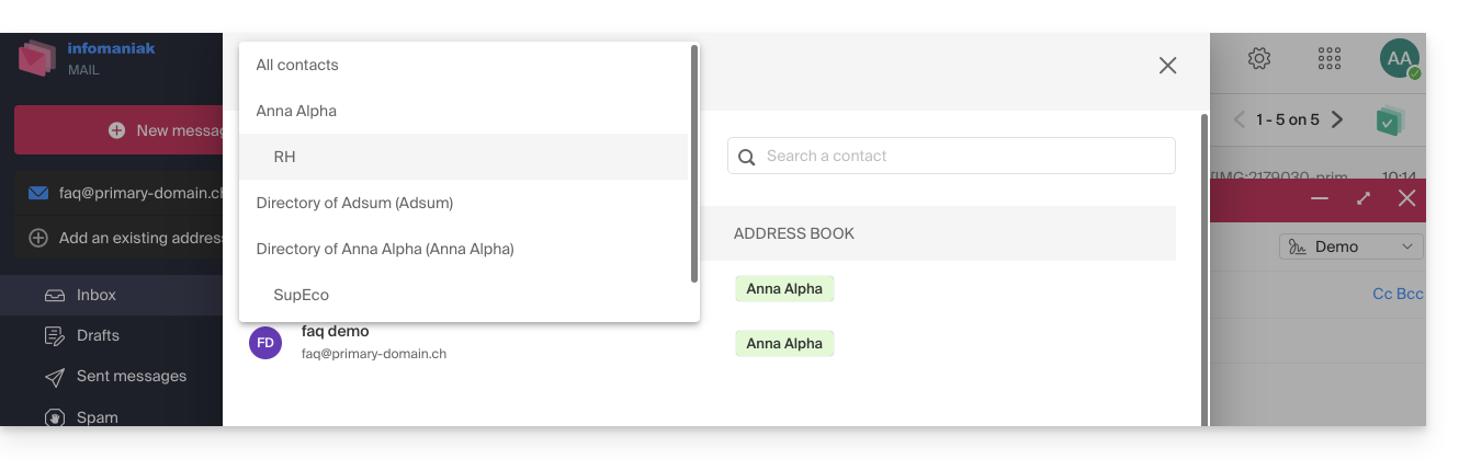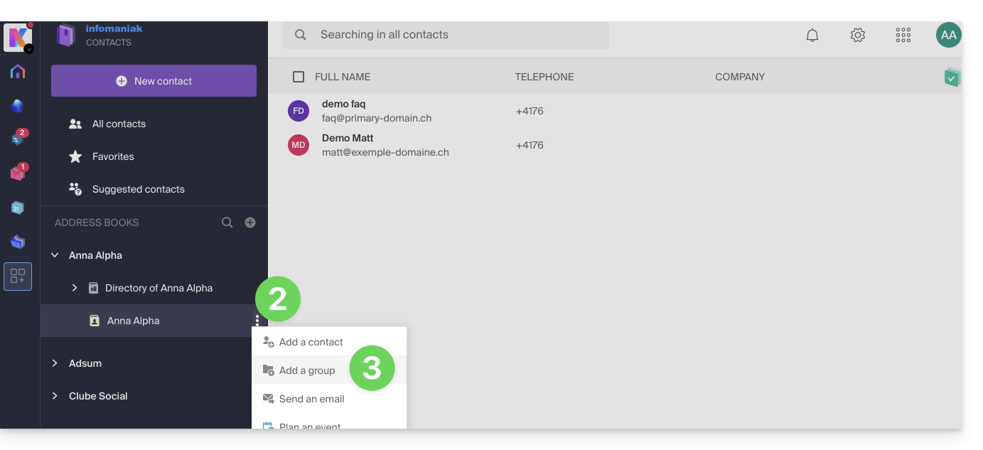 Sie können ein Adressbuch, eine Gruppe, eine Person unter Ihren Kontakten mit dem Suchfeld oben in Ihrem Infomaniak-Adressbuch suchen: