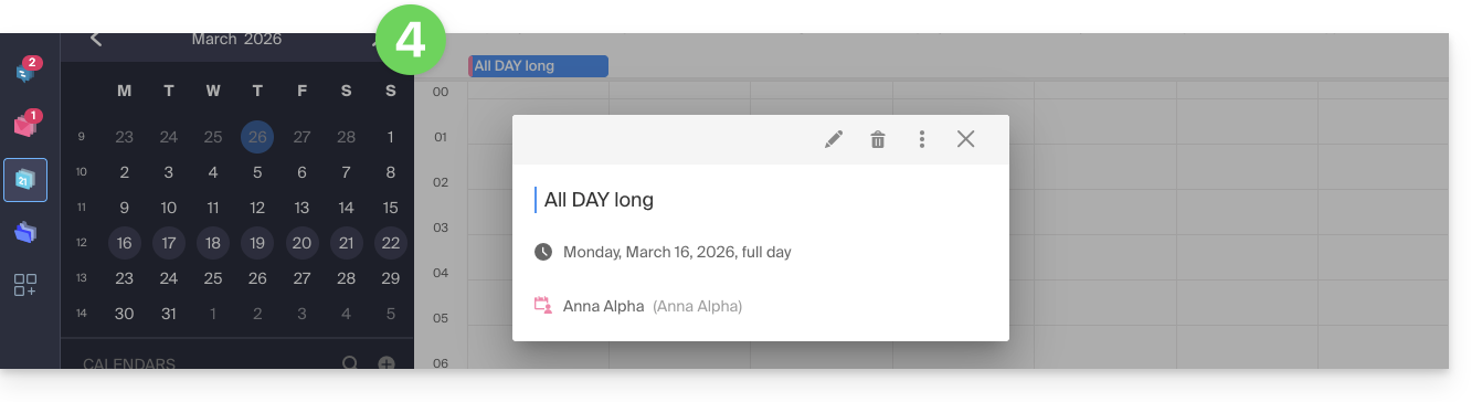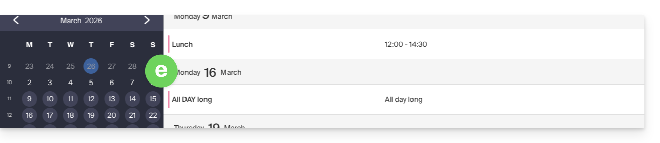 - Die Dauer des Ereignisses (und seine Positionierung innerhalb des Tages) kann geändert werden, auch im linken Bereich mit der Maus.