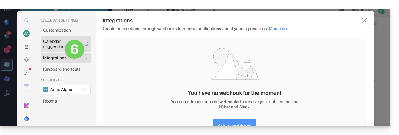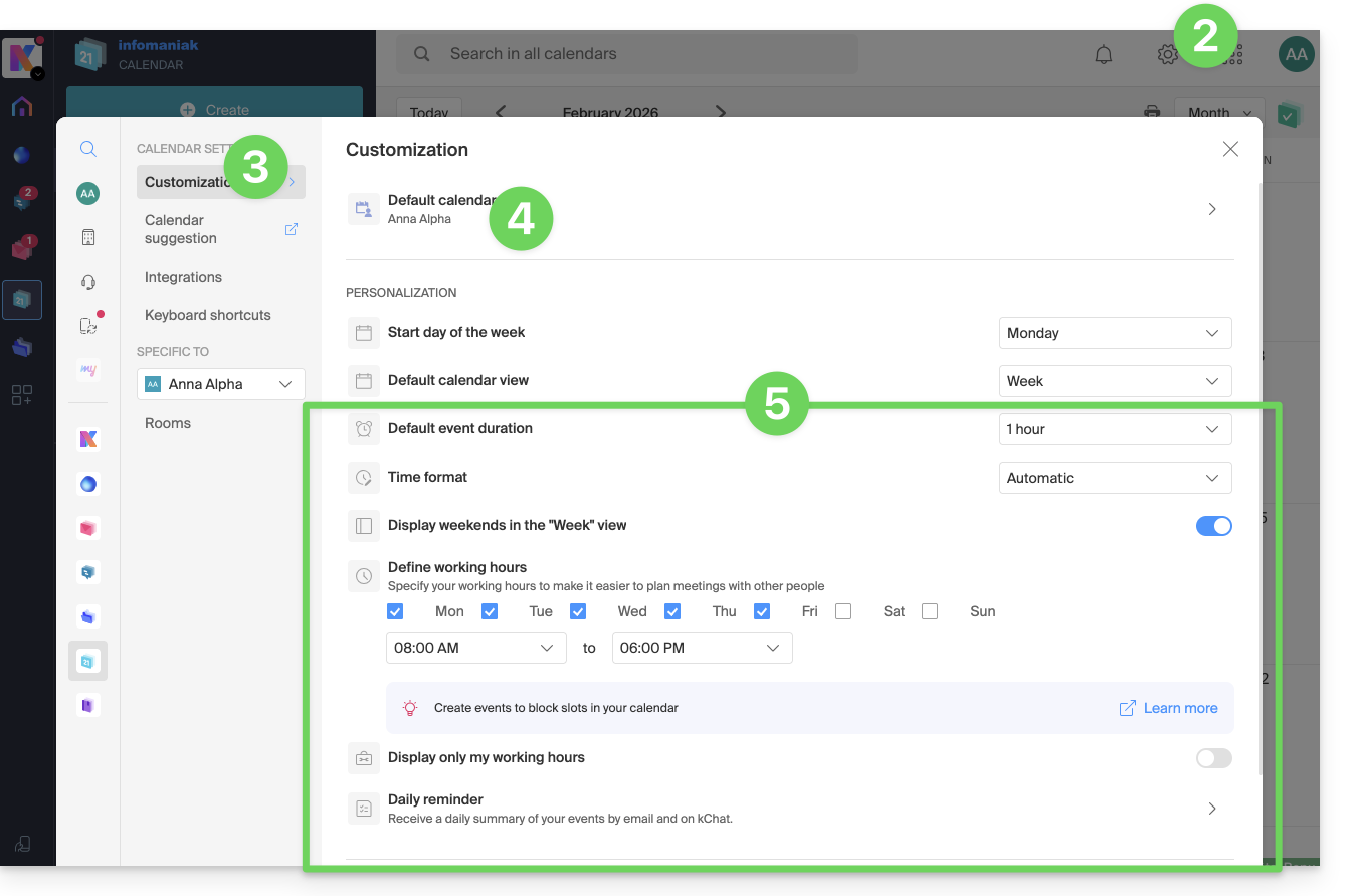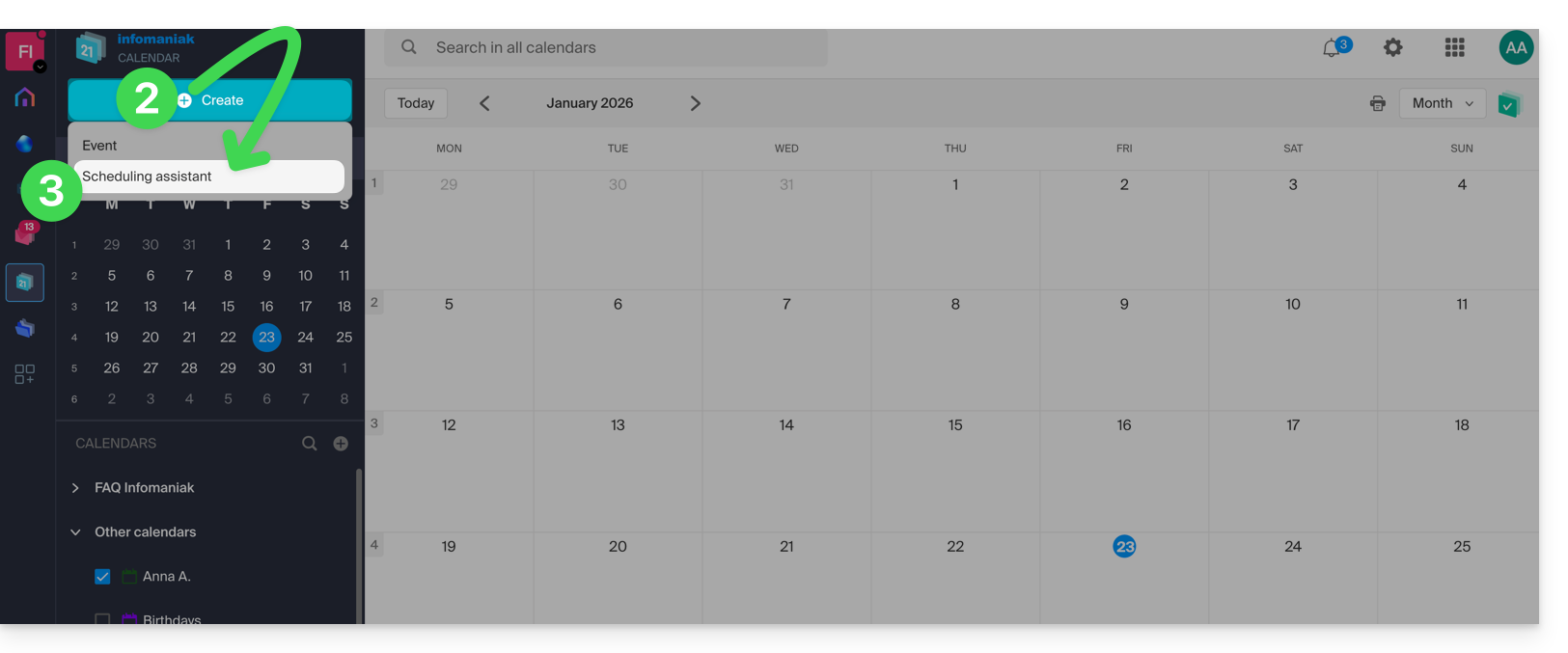 - Klicken Sie hier, um auf die Web-App Calendar von Infomaniak (Online-Dienst ksuite.infomaniak.com/calendar) zuzugreifen.
