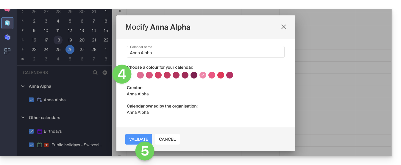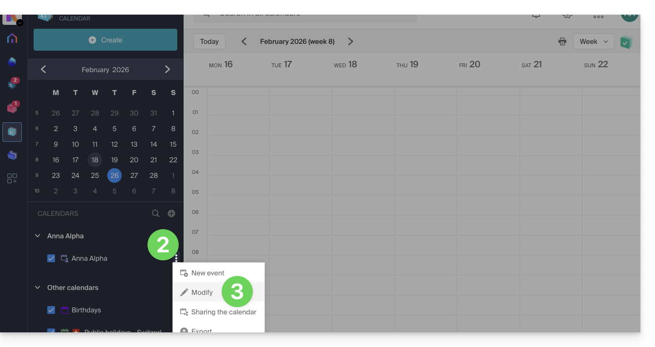 - Klicken Sie auf das Aktionsmenü ⋮ rechts neben dem bei Infomaniak importierten Kalender.