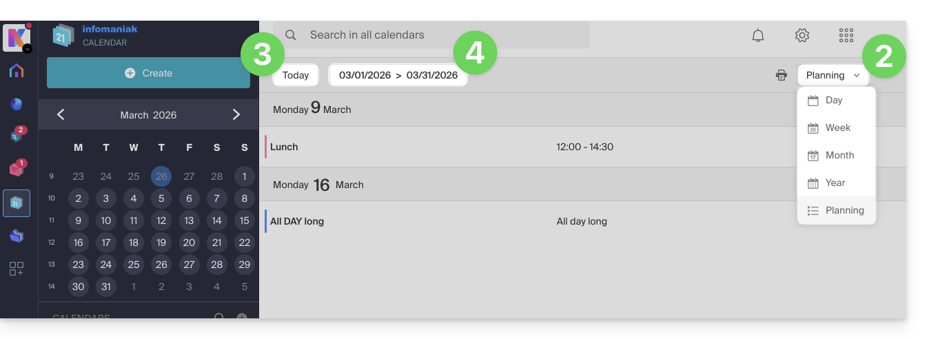 Diese Anleitung erklärt, wie Sie einen Kalender / Terminplaner aus der Web-App Calendar von Infomaniak (Online-Dienst ksuite.infomaniak.com/calendar) drucken.