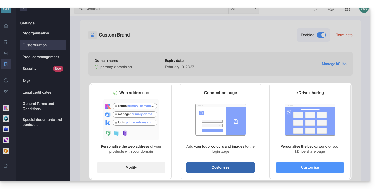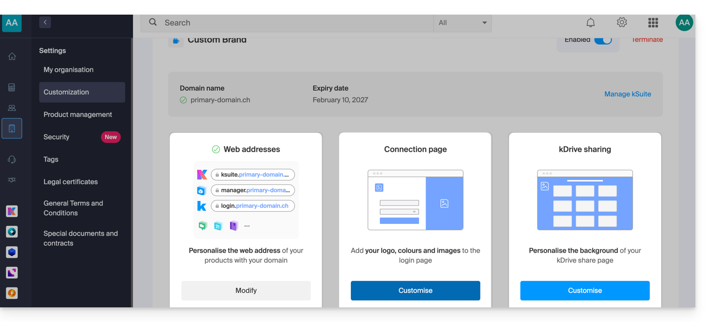 Dieser Leitfaden beschreibt die Möglichkeiten zur Anpassung der Infomaniak-Organisation, insbesondere die benutzerdefinierten URLs (Custom Brand-Adressen) für den Manager und die kSuite-Tools wie kDrive oder Euria.