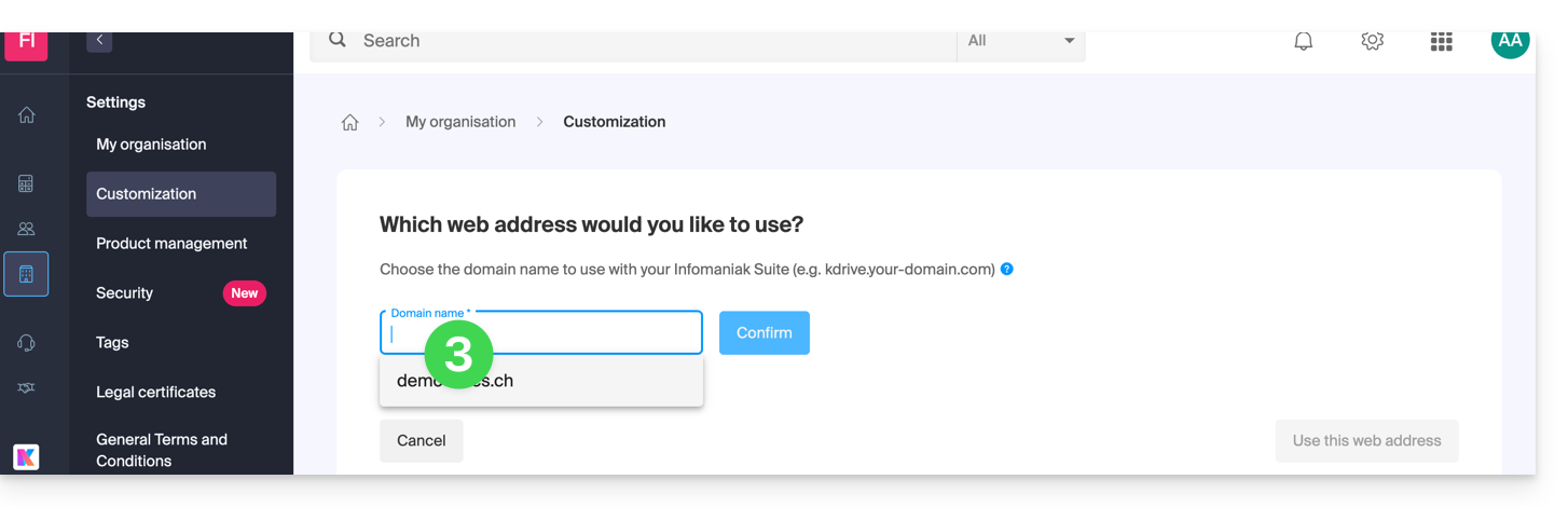 - Hier klicken um auf Custom Brand im Infomaniak Manager zuzugreifen (Hilfe benötigt?).