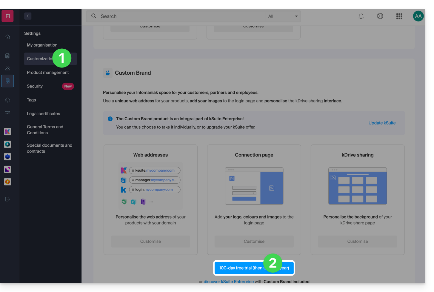 - Als Option mit jedem Infomaniak-Angebot oder bereits inbegriffen mit kSuite Enterprise, entdecken Sie dieses Personalisierungstool, um Ihre Webadressen einzigartig zu gestalten, ein Logo oder ein Bilddiaporama auf Ihrer Anmeldeseite zu Ihrer Infomaniak-Organisation hinzuzufügen.