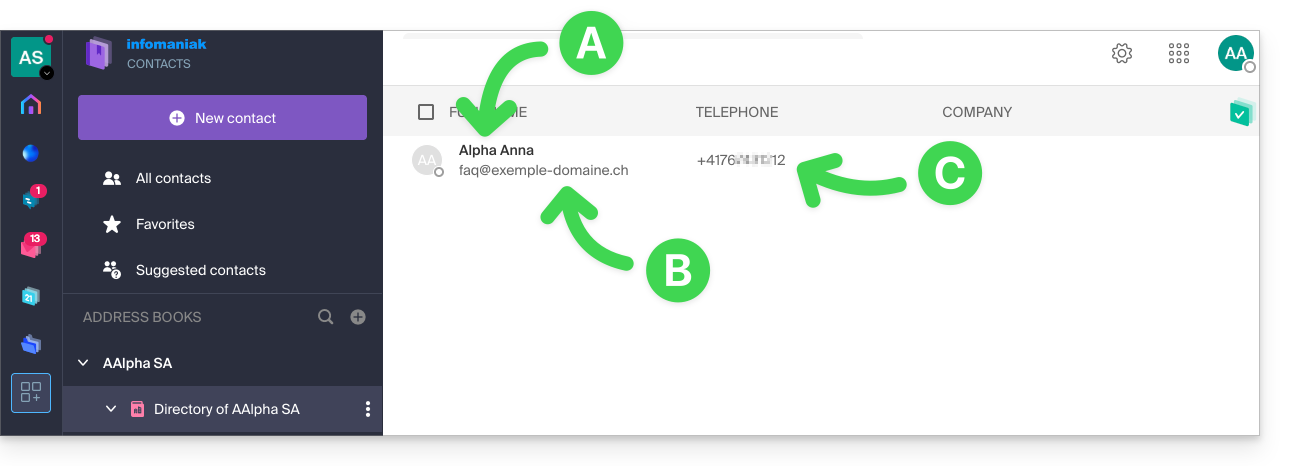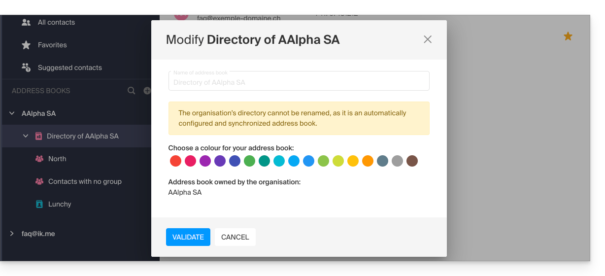 Um den im Verzeichnis sichtbaren Namen und Vornamen zu ändern, muss sich der betroffene Benutzer (hier faq@beispiel-domain.ch) bei seinem Konto anmelden und seine Kontaktdaten ändern. Nehmen Sie von diesem anderen Leitfaden zu diesem Thema Kenntnis.