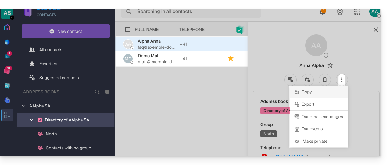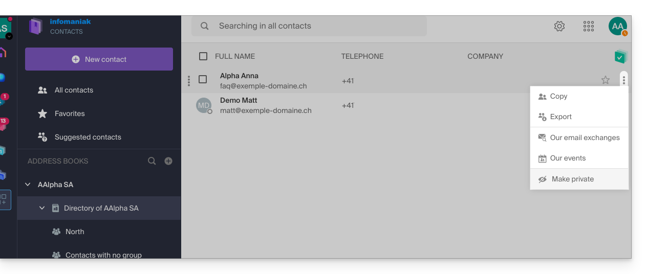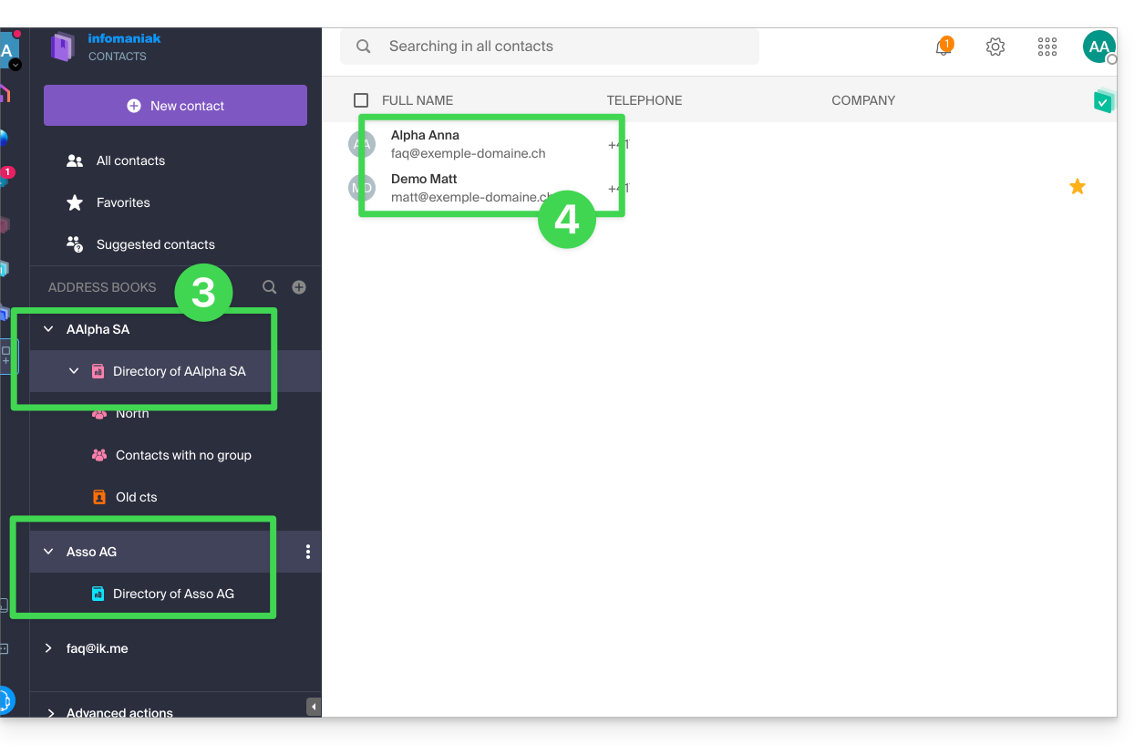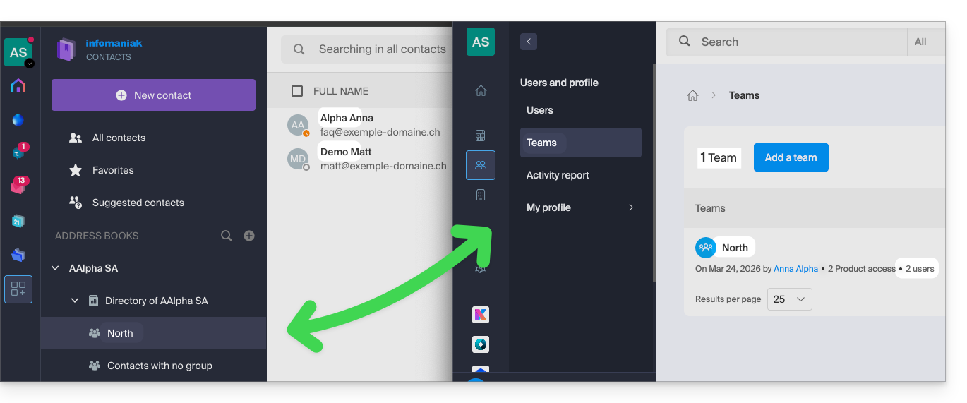 Dieser Leitfaden beschreibt die Verwaltung des Organisationsverzeichnisses, d.h. eines speziellen Adressbuchs, das in der Web-App Kontakte von Infomaniak (Online-Dienst ksuite.infomaniak.com/contacts) vorhanden ist.