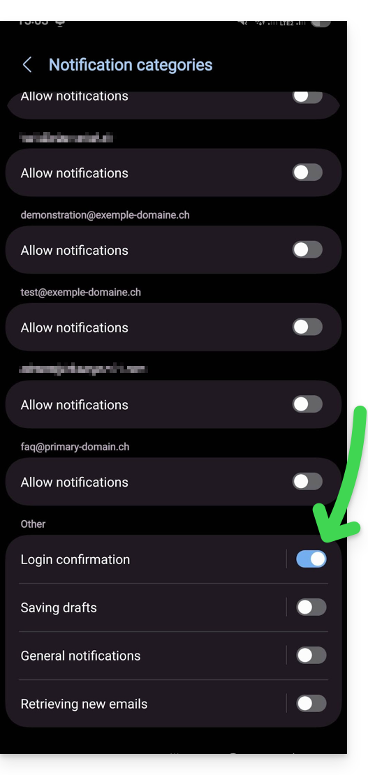 - In den Android-Einstellungen der Infomaniak-Apps (Mail) können Sie sich dafür entscheiden, nur die Benachrichtigung über die Anmeldeauthentifizierungsanfrage zu aktivieren: