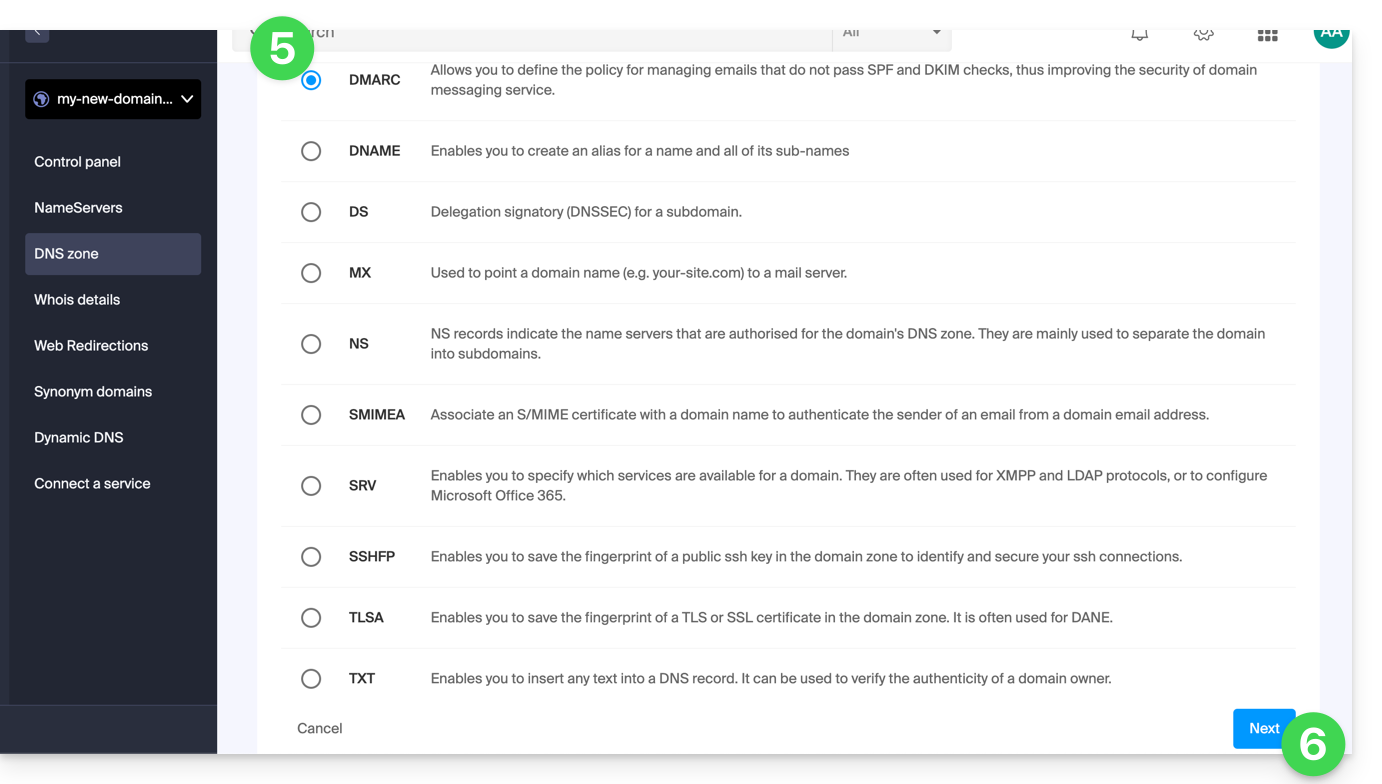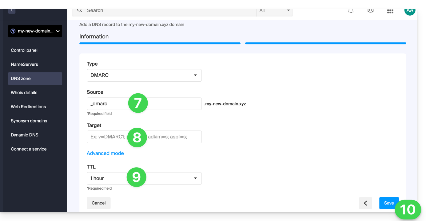 Wenn der Mail-Service nicht mehr funktioniert, Sie aber weiterhin E-Mail-Berichte erhalten, müssen Sie direkt auf den Domainnamen zugreifen und den Datensatz dmarc aus seiner DNS-Zone löschen: