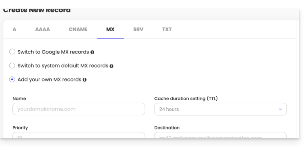 - Der Eintragstyp „MX“ ermöglicht es, anzugeben, bei welchem Anbieter die E-Mail-Adresse (= das Ziel) verwaltet werden soll.