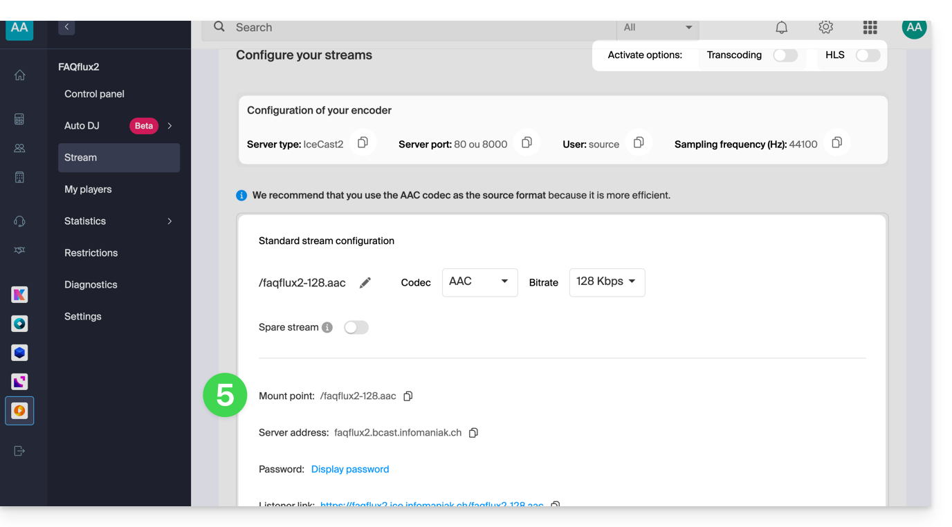 Der von Auto DJ erzeugte Stream ist ein Standard-Streaming-Stream, der von allen Tools des Infomaniak-Ökosystems profitiert: