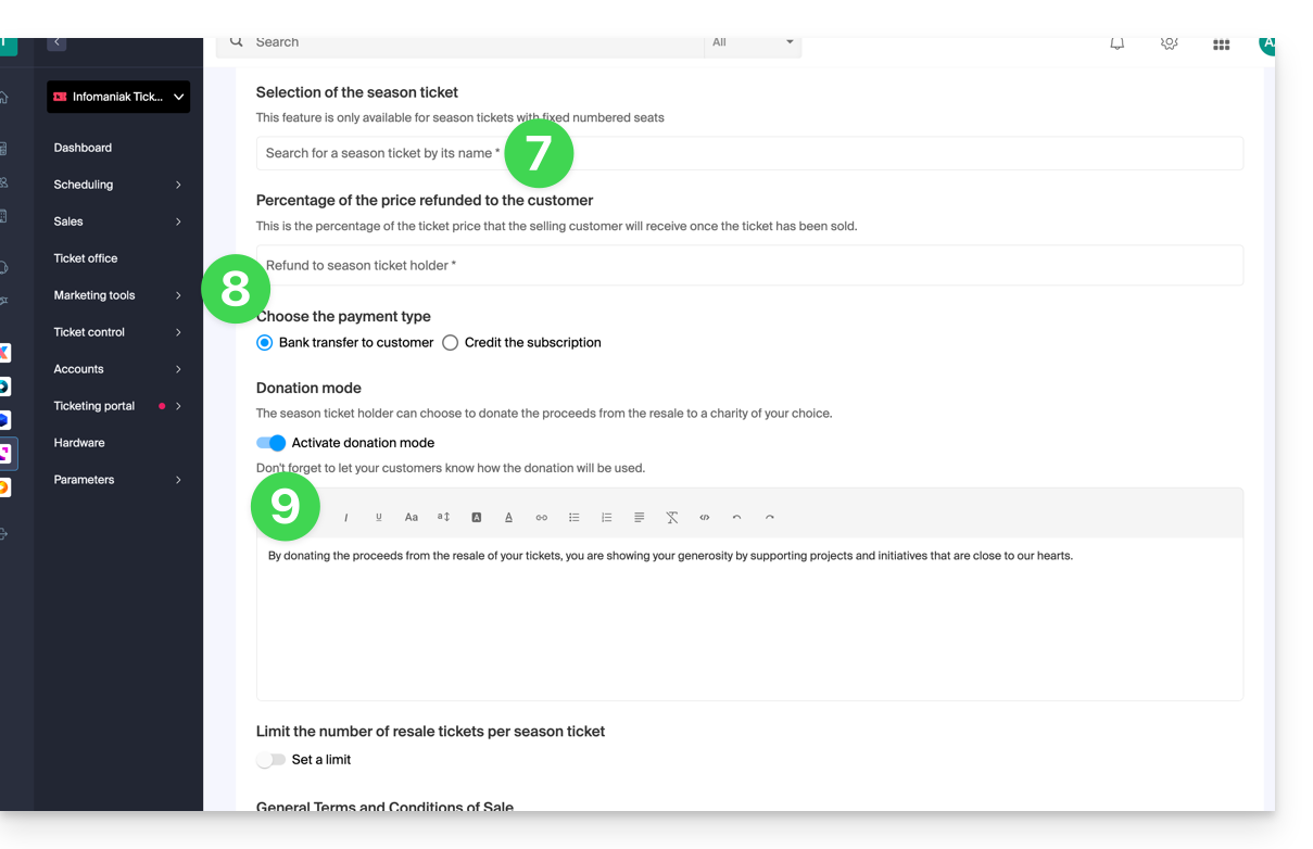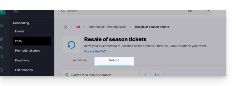 Diese Funktion ermöglicht es Abonnenten, die an einem oder mehreren Veranstaltungen während der Saison nicht teilnehmen können, die betreffenden Tickets (einschließlich ihres Abonnements) direkt über die Ticketverkaufsstelle (im Rahmen des Infomaniak-Ticketverkaufssystems) zu verkaufen.