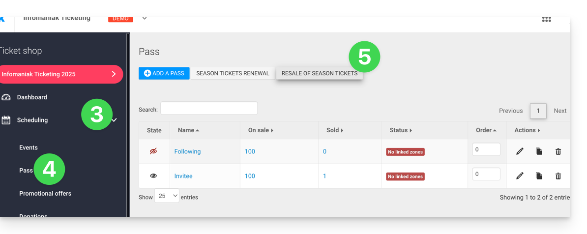 - Wenn ein Abonnent nicht die Möglichkeit hat, an einer Veranstaltung teilzunehmen, kann er aus dem Menü seines Passes Tickets zum Weiterverkauf anbieten.