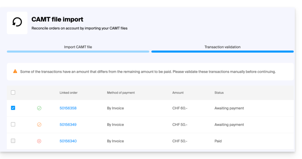- Der CAMT-Import erfordert, dass die Bank die mit der Bestellung verbundenen Informationen registriert, und diese Informationen sind nur vorhanden, wenn der Kunde die QR-Rechnung bei der Zahlung der Rechnung verwendet.