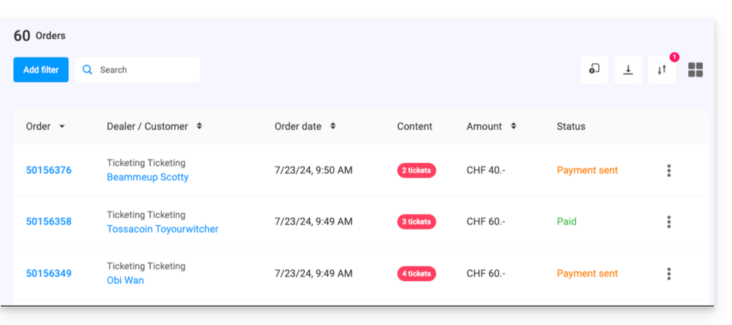 - Bestellungen mit einer Teilzahlung können manuell validiert werden, werden jedoch im Ticketing als vollständig registriert.