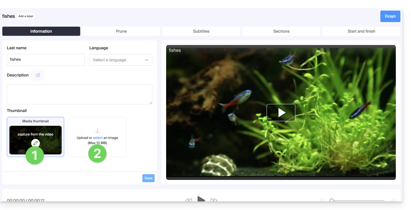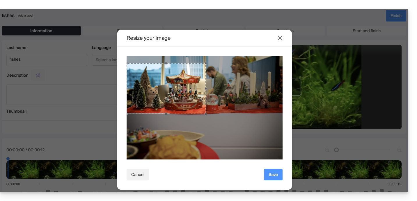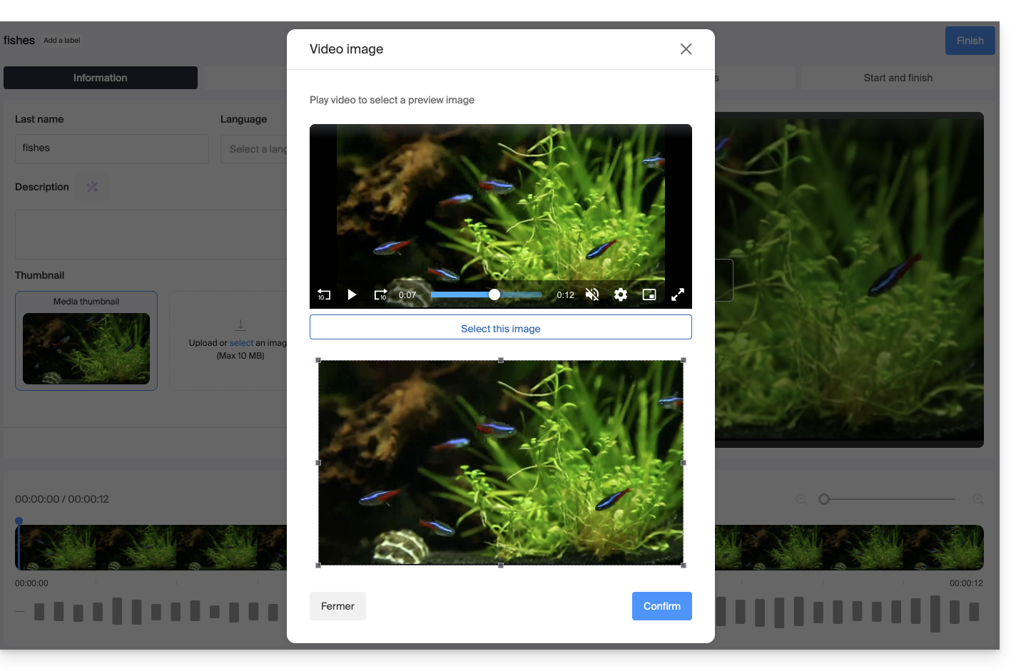 - Wählen Sie ein Bild innerhalb des Videos selbst aus (klicken Sie, um durch das Video zu blättern, und drücken Sie die Schaltfläche, um das Bild zu extrahieren, das Sie dann zuschneiden/skalieren können):