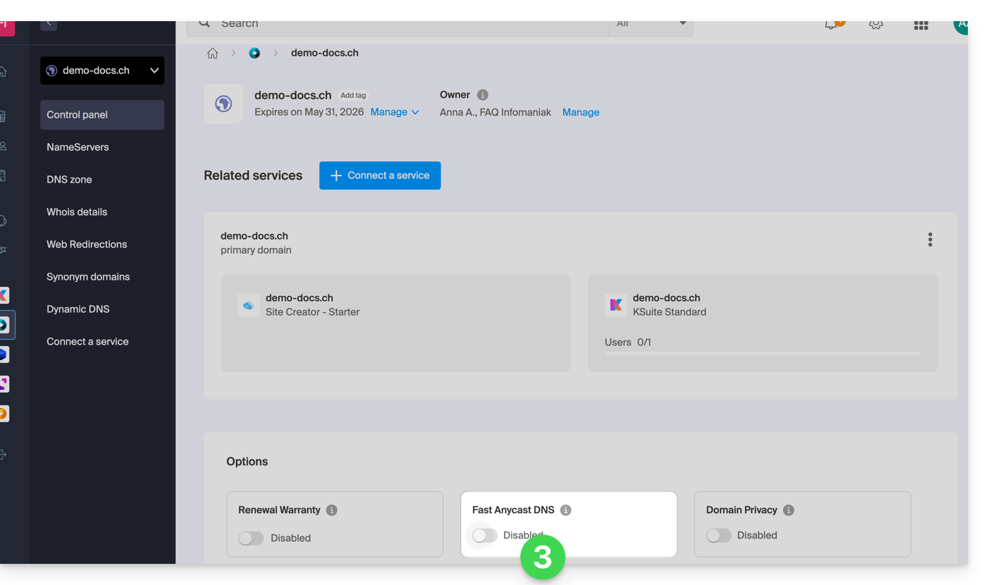 Indem Sie Ihre Domains, Websites und E-Mail-Adressen bei Infomaniak zusammenfassen, vereinfachen Sie die Verwaltung Ihrer Rechnungen und Dienstleistungen. Zudem wird die Verknüpfung Ihrer Domains automatisch mit Ihrer Website und Ihrer E-Mail-Adresse erfolgen. Sie müssen daher die DNS-Einstellungen Ihrer Domains bei einem anderen Registrar nicht manuell konfigurieren.
