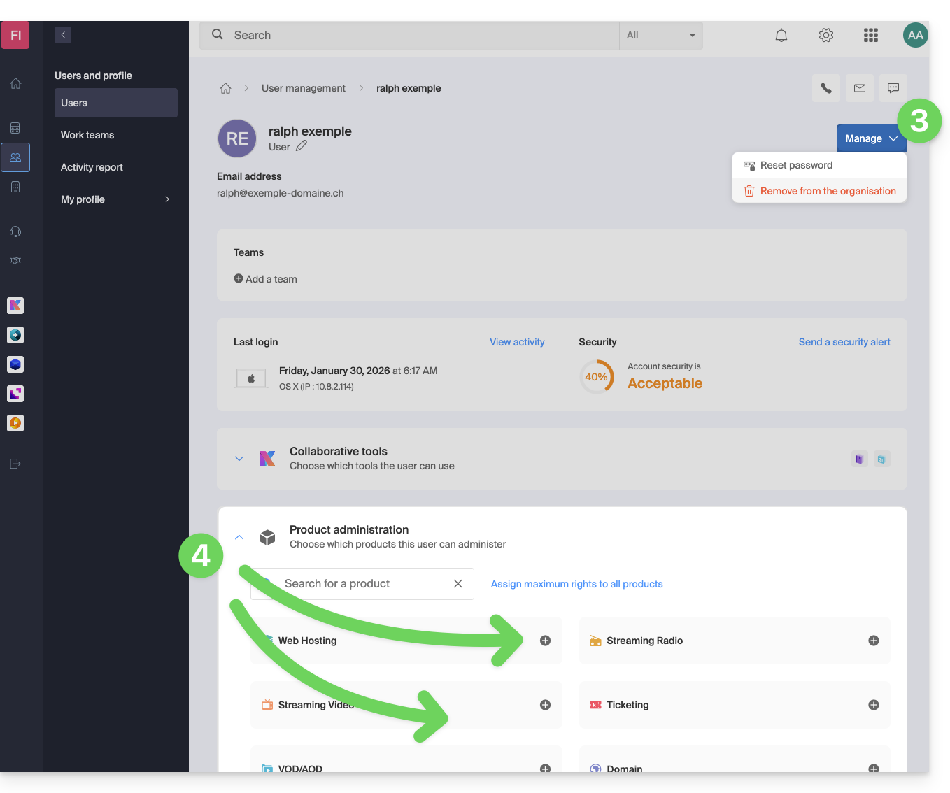 Dieser Leitfaden erklärt, wie Sie die Verwaltung eines Produkts aussetzen können, sodass kein Benutzer der Organisation es mehr im Manager von Infomaniak verwenden kann. Es ist auch möglich, einen Benutzer Ihrer Organisation zu sperren, ohne ihn zu löschen.