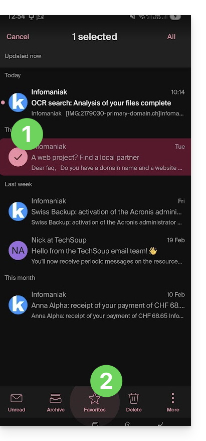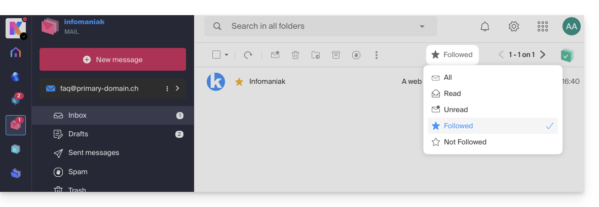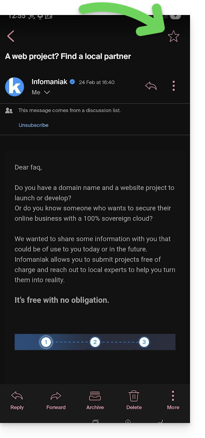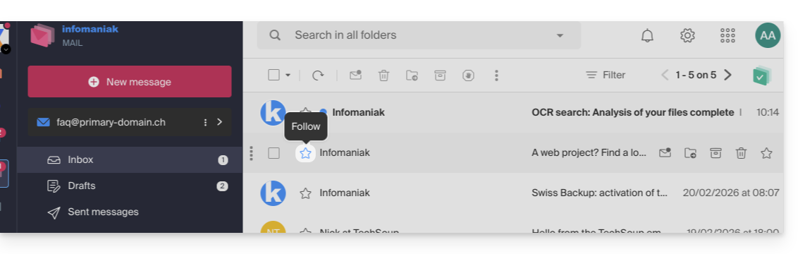 Diese Anleitung erklärt, wie Sie E-Mails Ihrer Wahl als "Favorit" in der Infomaniak-Mailbox markieren können, um diese Nachrichten besonders zu "verfolgen" und sie gegebenenfalls separat anzuzeigen.