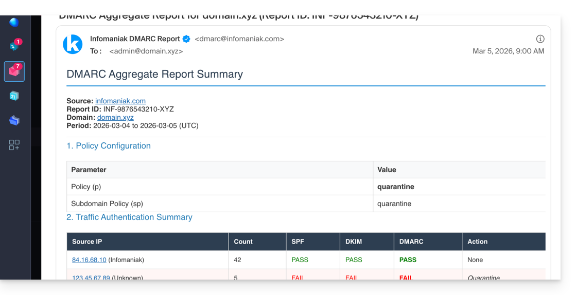 The written report is delivered as a ZIP archive containing the report in XML format. It is sent by email to the address you specify in the configuration, and will come from dmarc@infomaniak.com or other providers such as Microsoft, Google, Yahoo, etc.: