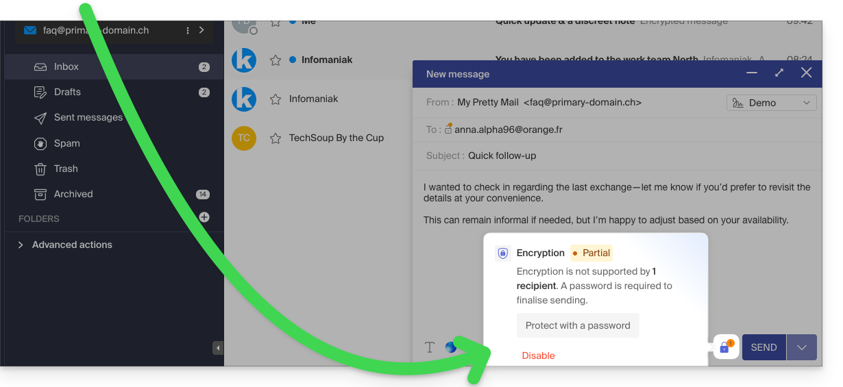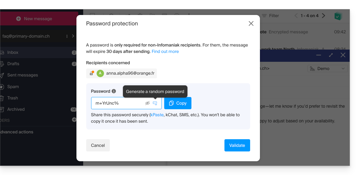 If the recipient of the encrypted email has an email address managed outside of Infomaniak services, encryption is still possible, but it requires setting a password: