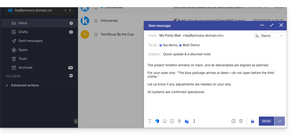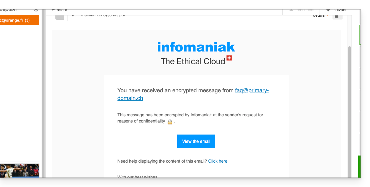 If the recipient of the encrypted email has an email address managed by Infomaniak, encryption is done completely transparently for both the sender and the recipient: