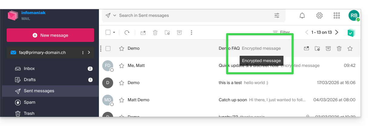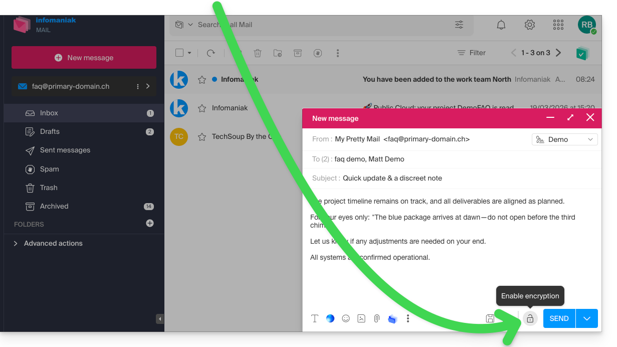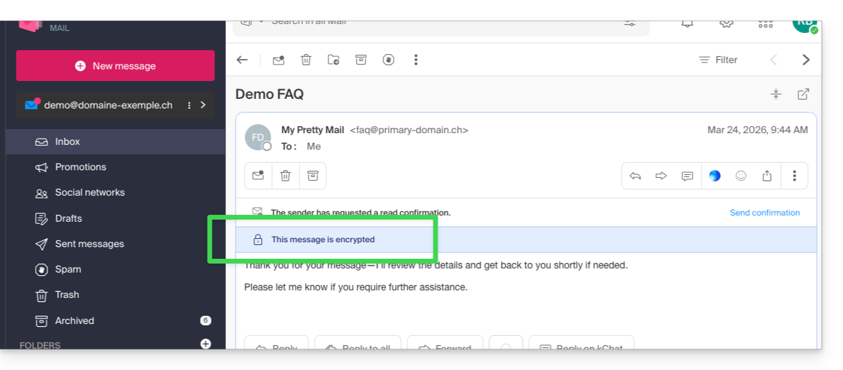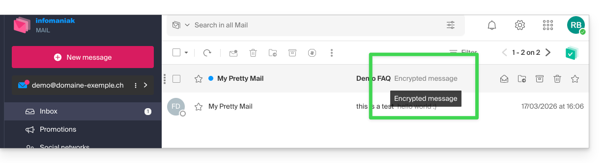 If the recipient of the encrypted email has an email address managed with Infomaniak, encryption is done in a completely transparent manner for both the sender and the recipient. A note will indicate the encryption of the message…