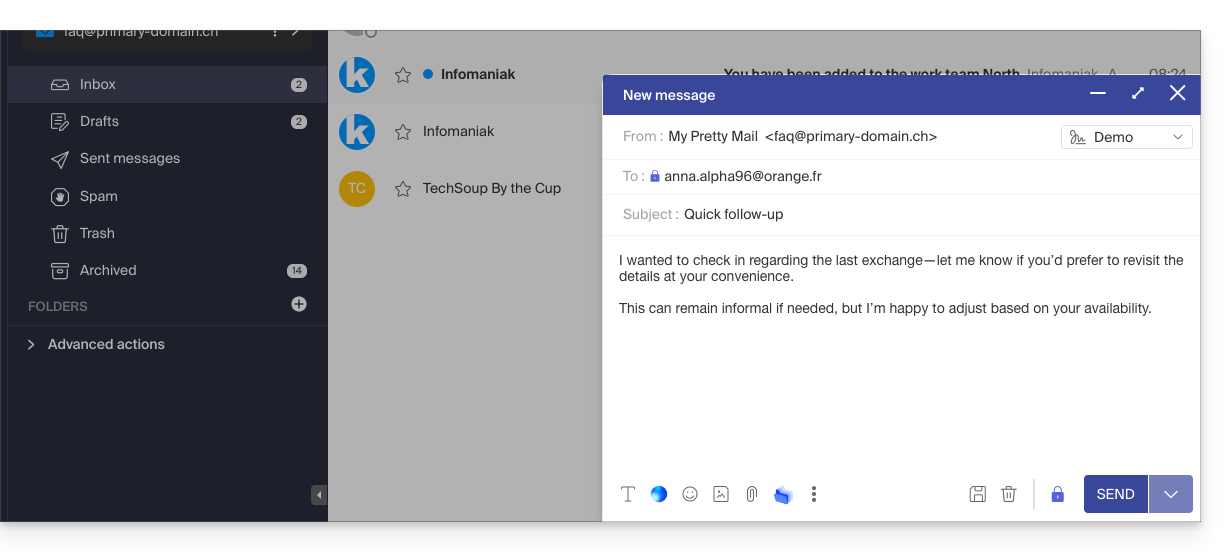 2. Compose a new message as usual, but addressed to an email address outside of Infomaniak.